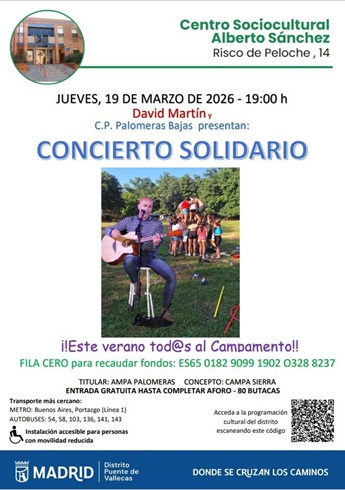Este concierto tiene una finalidad solidaria para recaudar fondos, a través de Fila Cero a favor de la Comisión Campamento Sierra del C.P. Palomeras Bajas, la cual organiza un campamento cada verano de 14 días, para que más chicas y chicos puedan participar.