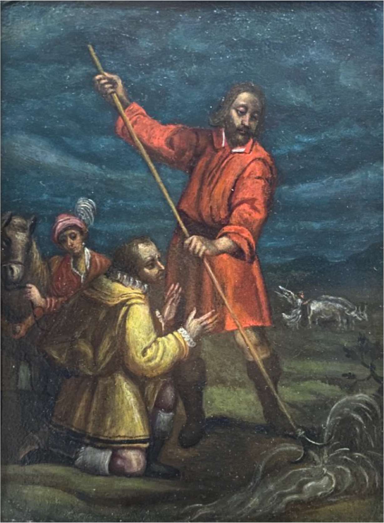 En segundo plano se vislumbra el milagro de los bueyes en un paisaje en el que aparecen al fondo montañas, apenas esbozadas.