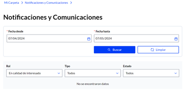 Al acceder al módulo se encuentra un buscador para mostrar las notificaciones o comunicaciones según su fecha de envío.