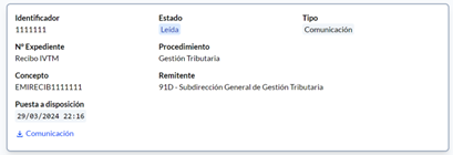 Realizada la búsqueda, para cada resultado de la misma se ofrecen entre otros datos los relativos al asunto, tipo (comunicación/notificación) y estado, en el que se indica “puesta a disposición”.
