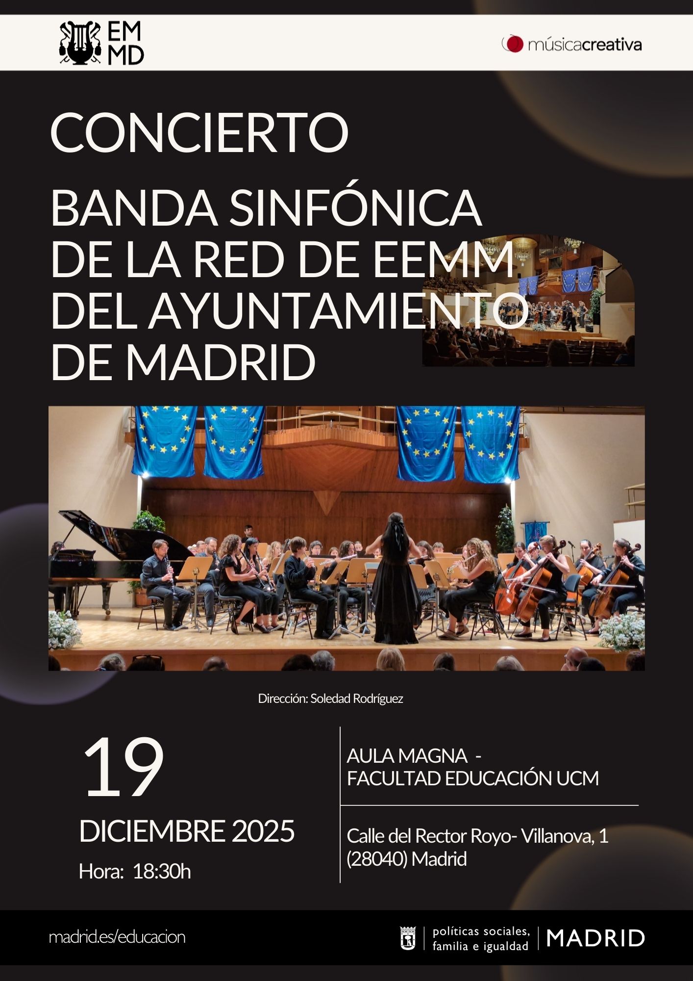Concierto ofrecido por la Banda Sinfónica de la RED de las EEMM de MadridConcierto ofrecido por la Banda Sinfónica de la RED de las EEMM de Madrid. Aula Magna de la Facultad de Educación UCM (C/ Rector Royo-Villanova, 1. Madrid) 19 de diciembre de 2025 a las 18:30 hrs. -