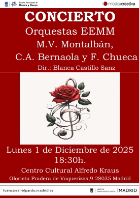 Concierto a cargo de las Orquestas de las EEMM Manuel Vázquez Montalbán, Carmelo Alonso Bernaola y Federico ChuecaConcierto a cargo de las Orquestas de las EEMM Manuel Vázquez Montalbán, Carmelo Alonso Bernaola y Federico Chueca. Centro Cultural Alfredo Kraus (Glorieta Pradera de Vaquerizas, 9- 28035 Madrid) 1 de diciembre de 2025 a las 18:30 hrs. -
