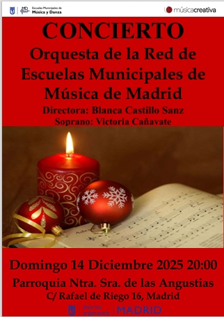 Concierto a cargo de la Orquesta de la RED de las EEMM de MadridConcierto a cargo de la Orquesta de la RED de las EEMM de Madrid. Parroquia Nuestra Señora de las Angustias (calle Rafael de Riego, 16 Madrid) 14 de diciembre de 2025 a las 20:00 hrs. -