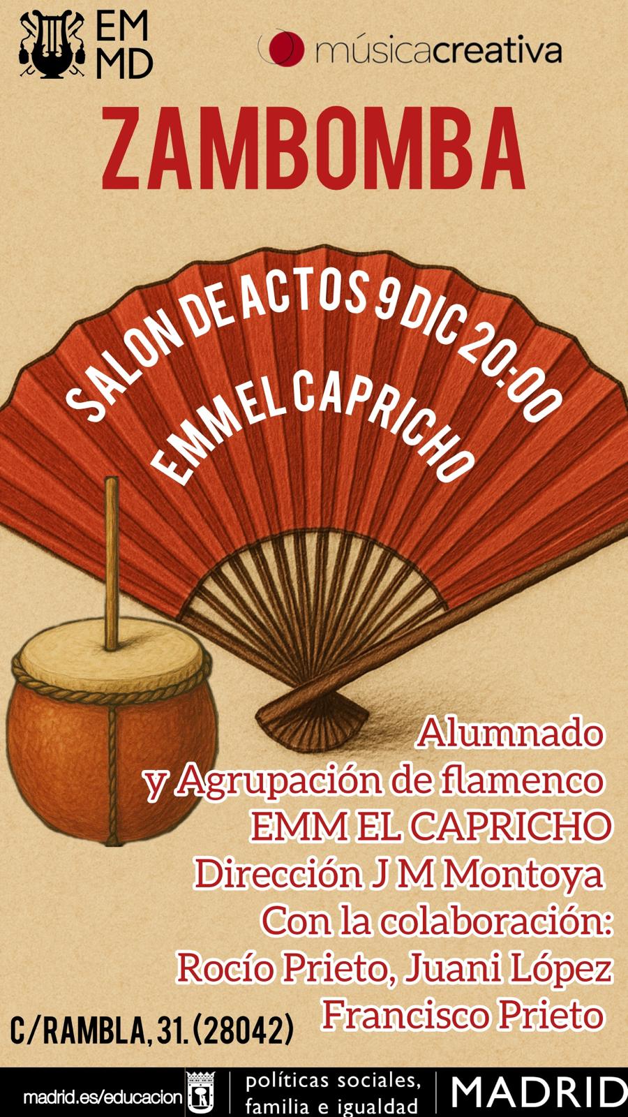 Concierto a cargo del alumnado y Grupo flamenco de la EMM El CaprichoConcierto a cargo del alumnado y Grupo flamenco de la EMM El Capricho. 9 de diciembre a las 20:00 hrs. Salón de actos de la EMM El Capricho (calle Rambla, 31- 28042 Madrid) -