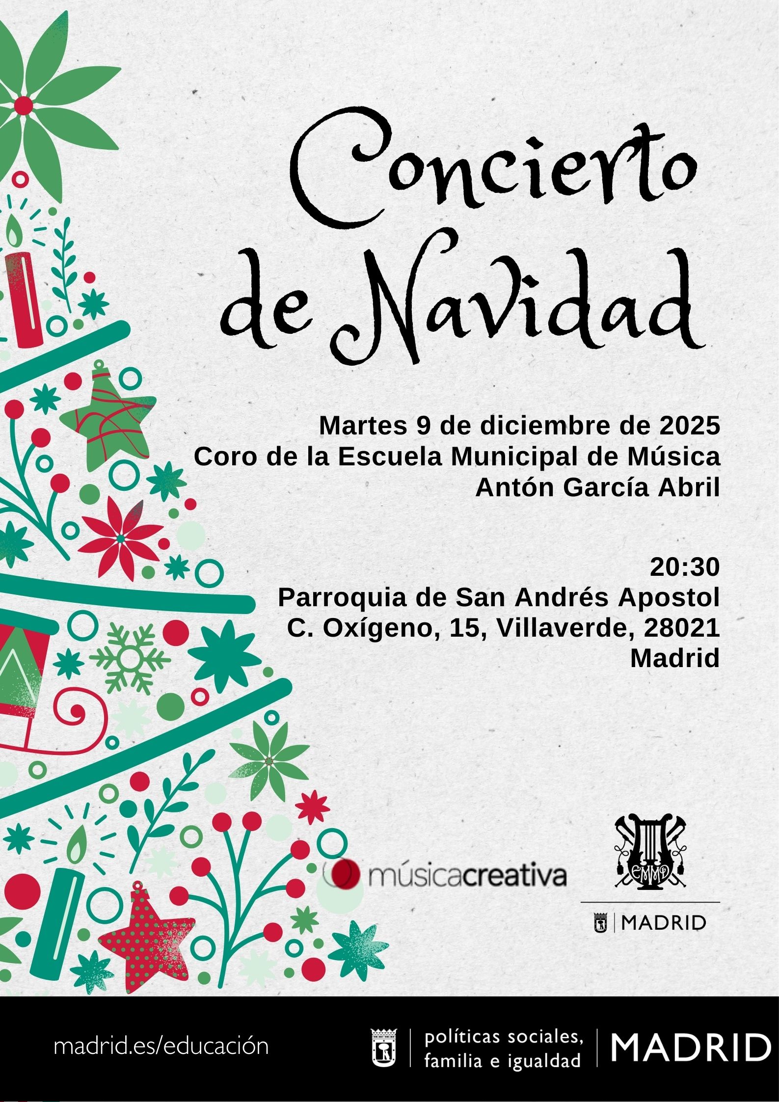Concierto de Navidad ofrecido por el Coro de la EMM Antón García AbrilConcierto de Navidad ofrecido por el Coro de la EMM Antón García Abril. 9 de diciembre de 2025 a las 20:30 hrs. Parroquia de San Andrés Apóstol (calle Oxígeno, 15 Villaverde-28021 Madrid) -