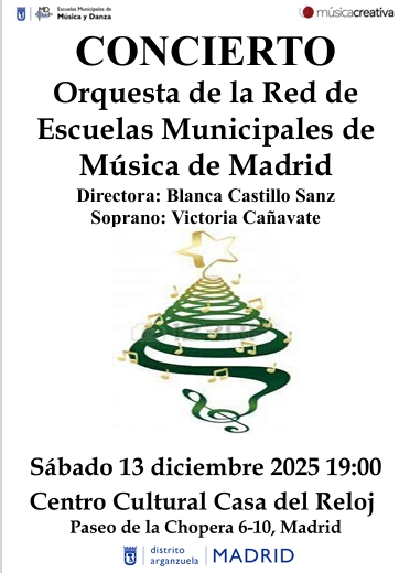 Concierto a cargo de la Orquesta de la RED de las EEMM MadridConcierto a cargo de la Orquesta de la RED de las EEMM Madrid Centro Cultural “Casa del Reloj” (Paseo de la Chopera, 6-10, Madrid) 13 de diciembre de 2025, a las 19:00 hrs. -