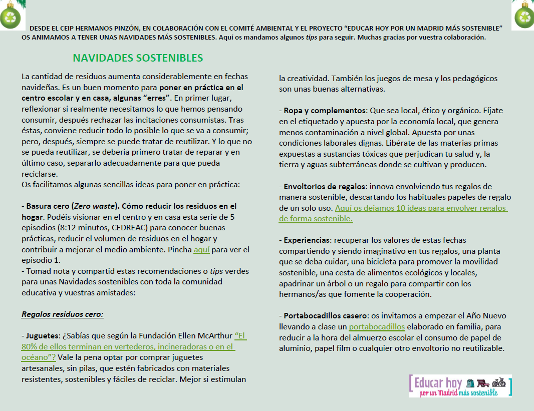 Imágenes de las Navidades sostenibles en el CEIP Hermanos Pinzón 13 de enero de 2023