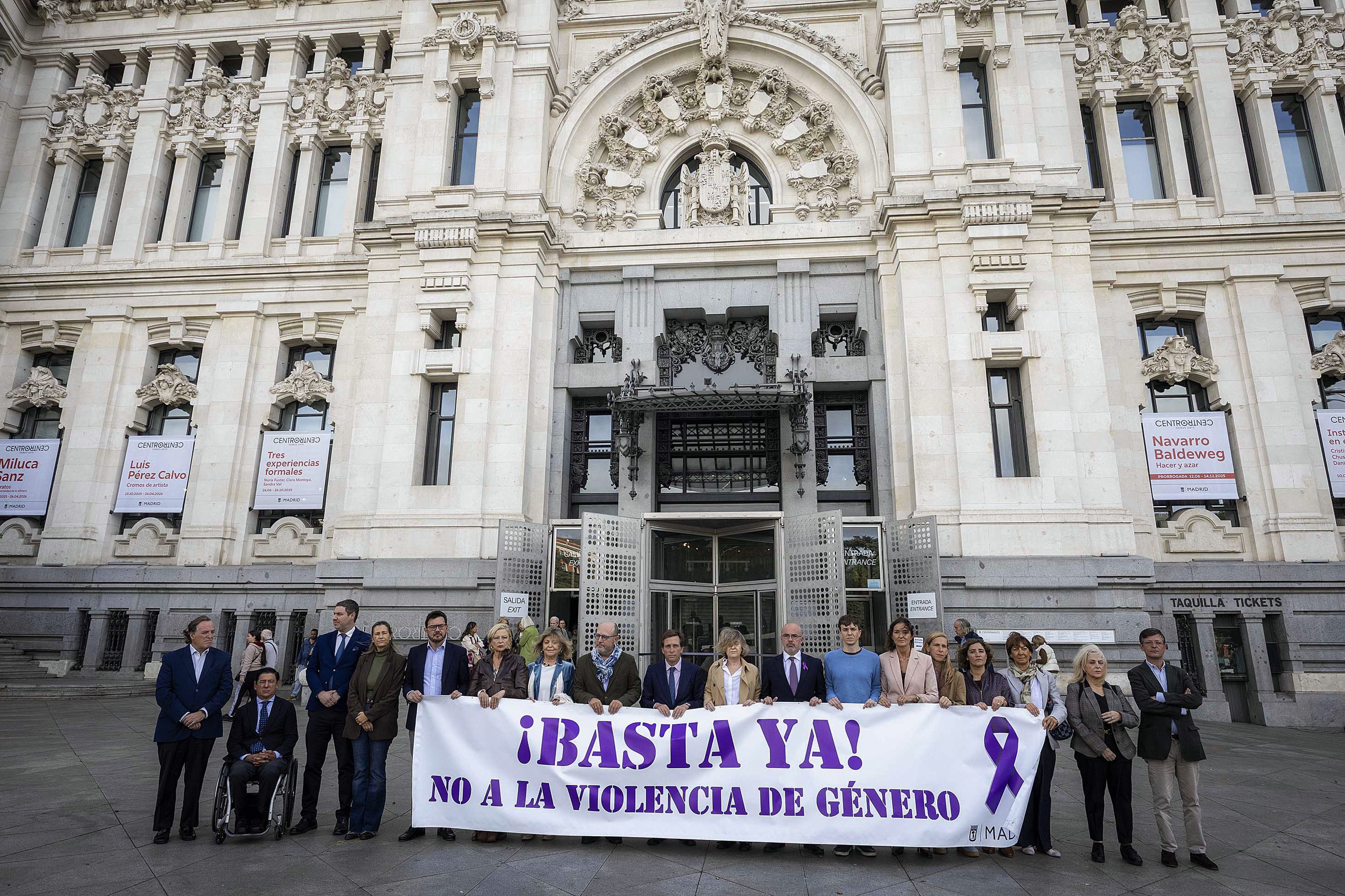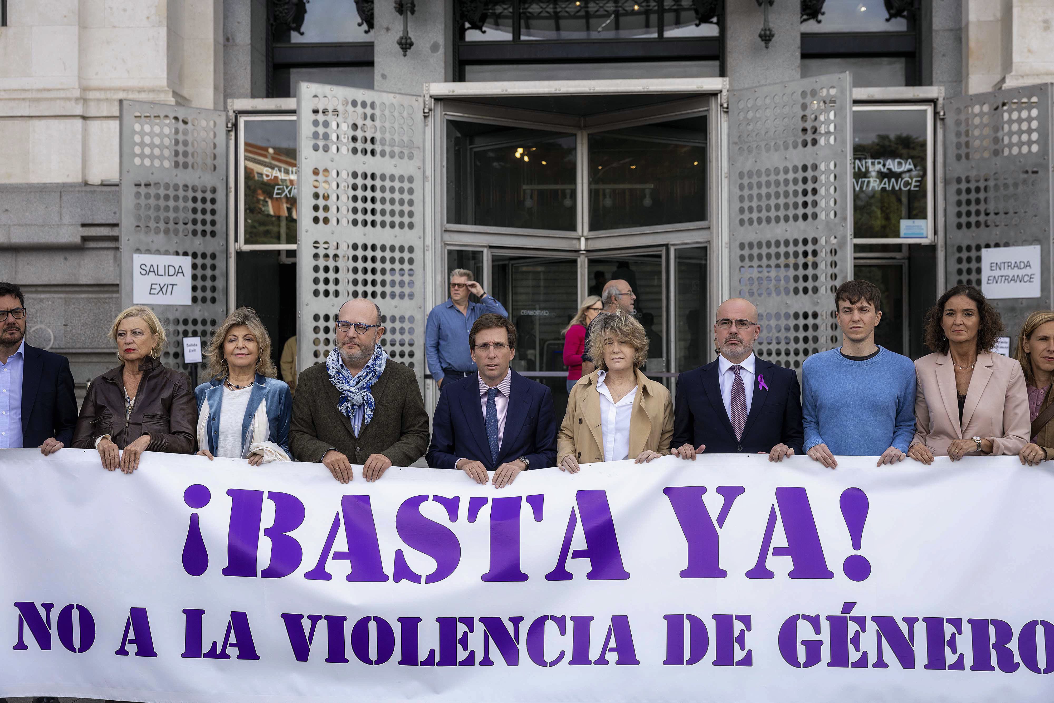 El alcalde de Madrid, José Luis Martínez-Almeida, acompañado de varios miembros del Gobierno municipal y representantes de los grupos políticos en el Ayuntamiento, ha presidido el minuto de silencio convocado hoy por el Consistorio en repulsa por el asesinato el pasado lunes, por presunta violencia de género, de una vecina del distrito de Villaverde de 21 años. Este acto se suma al minuto de silencio convocado por el Ayuntamiento de Madrid a las puertas de todas las dependencias municipales.