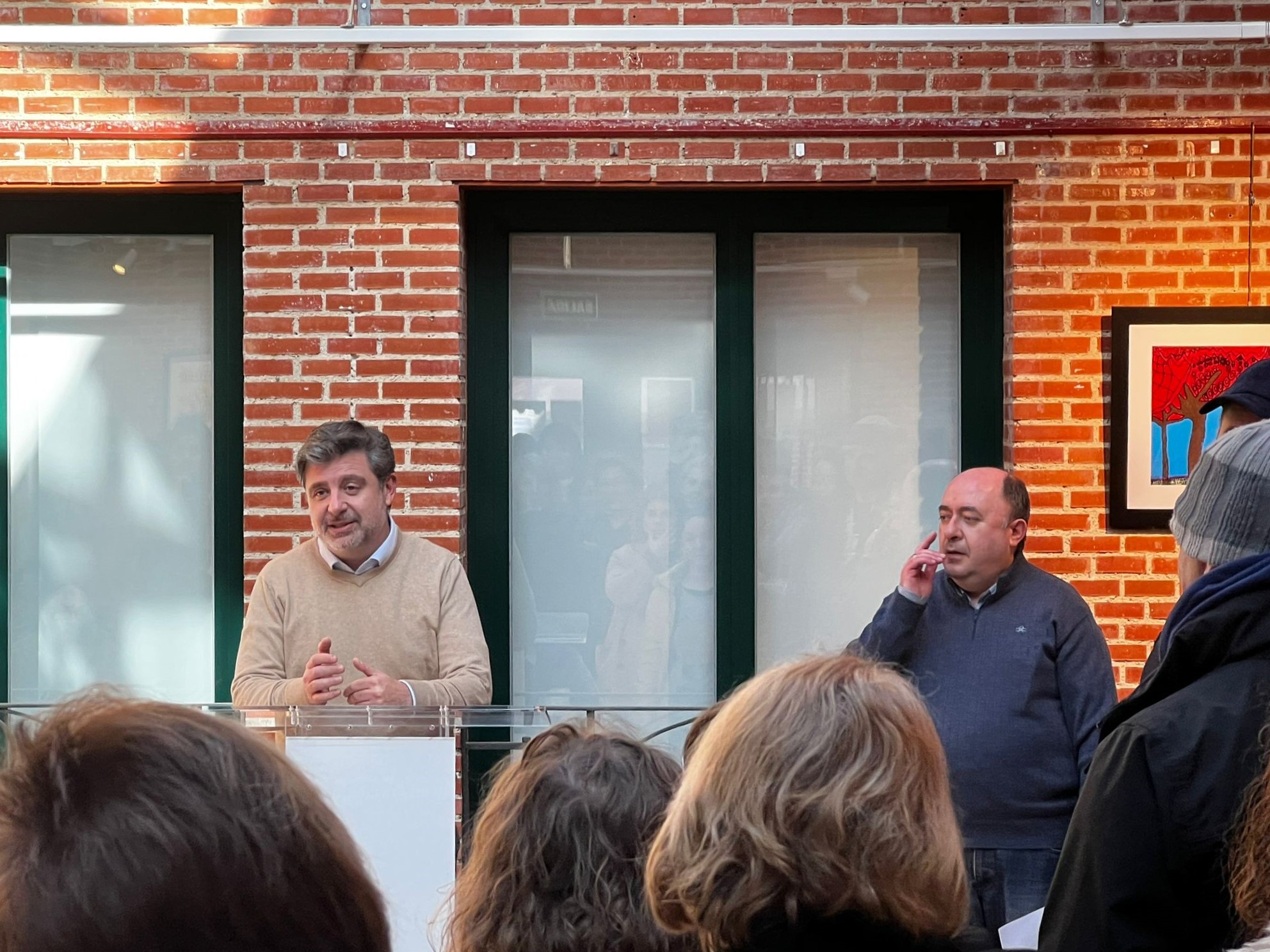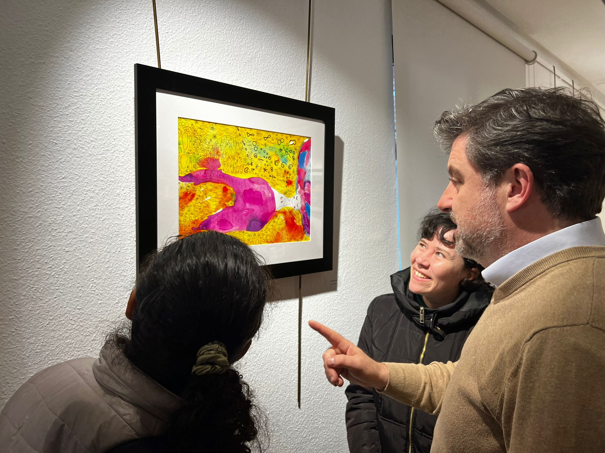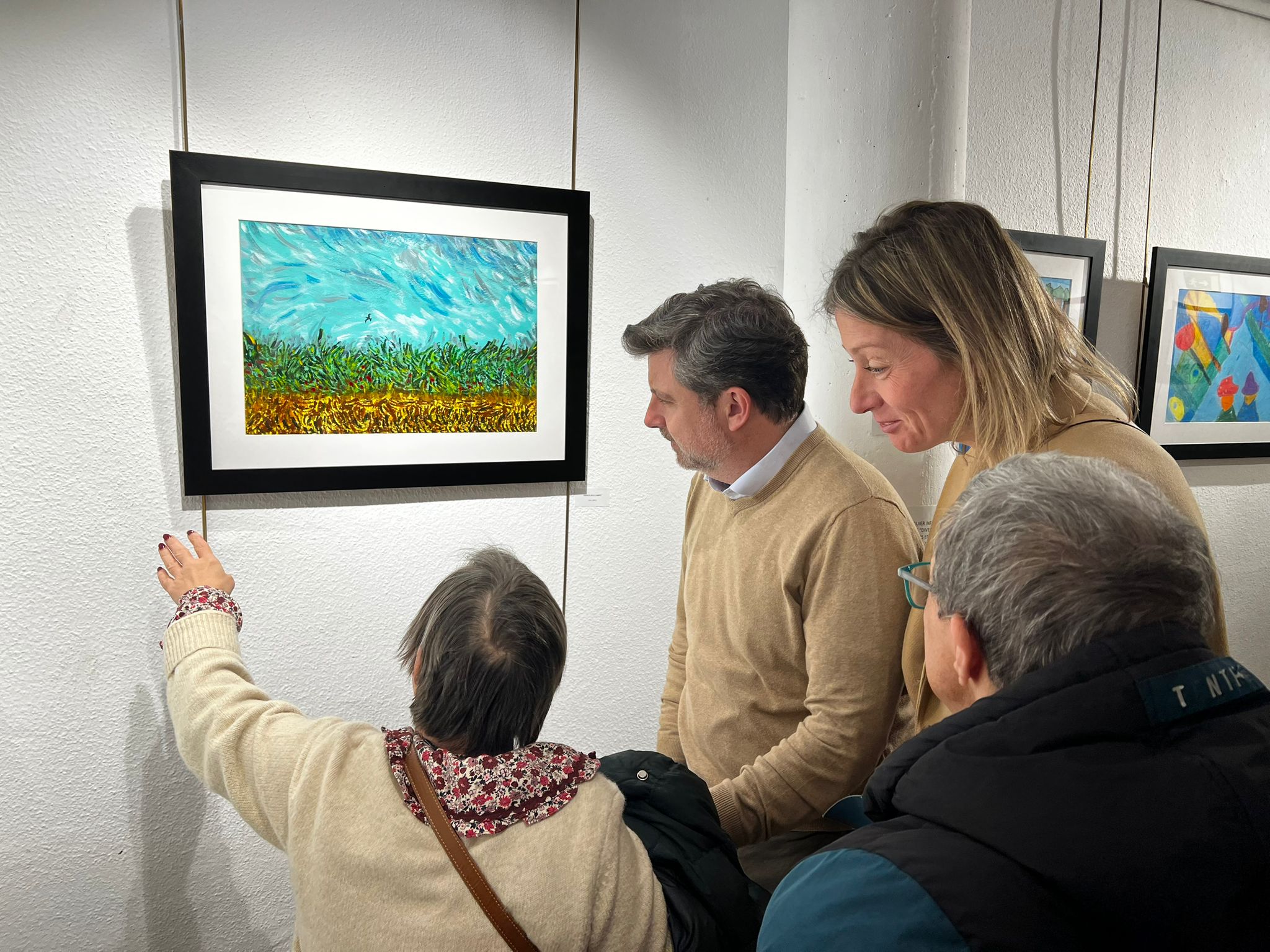 El concejal de Barajas, Juan Peña, durante la inauguración de la exposición de pintura Diversa, en contacto con algunos de los artistas participantes