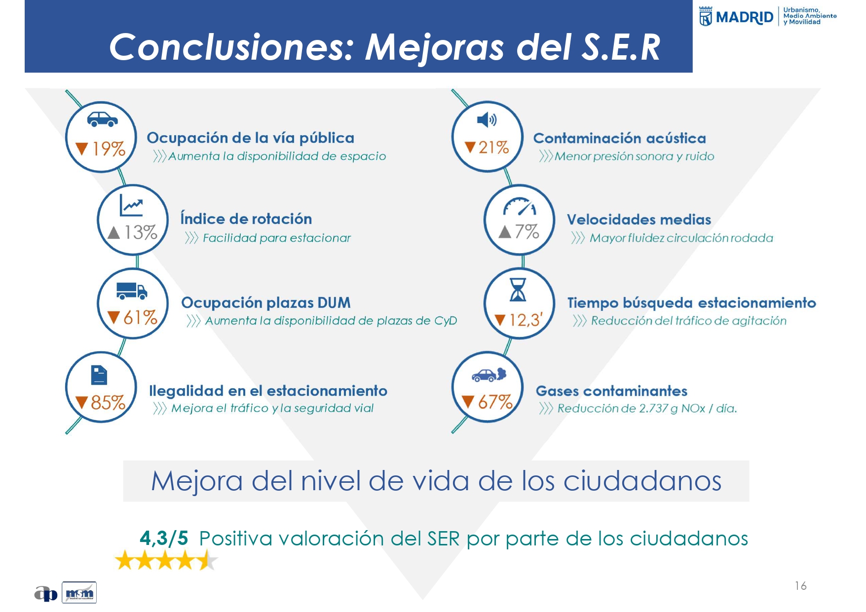 -Tiempo de búsqueda de aparcamiento: tanto los residentes como los no residentes han visto cómo se ha reducido de forma muy notable el tiempo que tardan en aparcar. A nivel general, se ha reducido en más de 12 minutos, al pasar de los 19:30 minutos que empleaban en buscar estacionamiento antes del SER hasta los 7:13 minutos actuales.