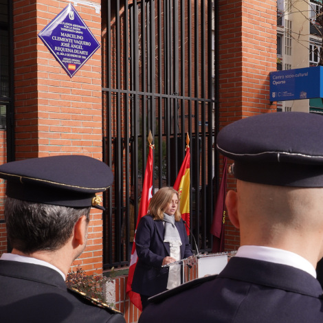 Sanz destaca la necesidad de “mantener vivo nuestro recuerdo de las víctimas y nuestro rechazo al terrorismo y a toda forma de violencia política”La vicealcaldesa de Madrid y delegada de Seguridad y Emergencias, Inma Sanz, ha descubierto esta mañana, en el distrito de Carabanchel, una placa en homenaje y recuerdo a Marcelino Clemente Vaquero y a José Ángel Requena Duarte, dos policías nacionales que fueron asesinados por un miembro de la banda terrorista GRAPO (Grupo de Resistencia Antifascista Primero de Octubre) el 2 de enero de 1984.