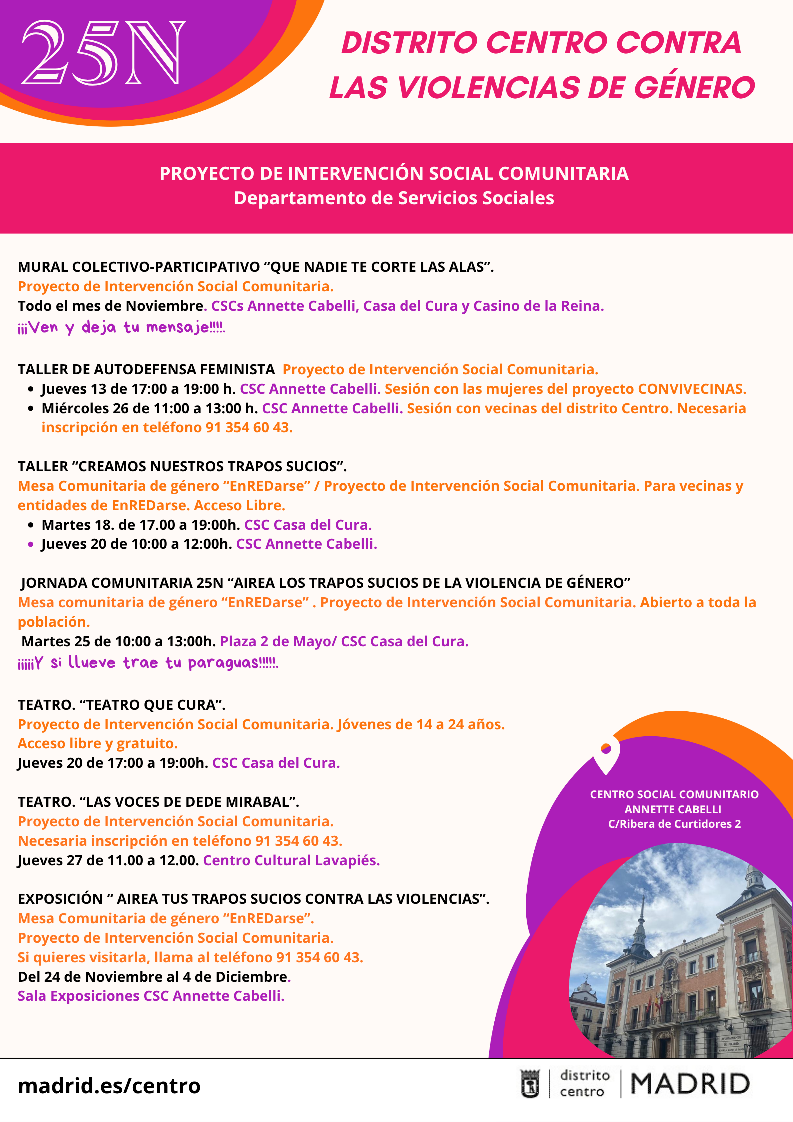 El distrito de Centro se suma un año más a la conmemoración del Día Internacional de la Eliminación de la Violencia contra la Mujer, que se celebra cada 25 de noviembre, con un amplio programa de actividades. Las propuestas se desarrollarán en el Centro Cultural Lavapiés (calle del Olivar, 46) y en los centros sociales comunitarios Annette Cabelli (Ribera de Curtidores, 2), Casa del Cura (plaza del Dos de Mayo, 1) y Casino de la Reina (calle del Casino, 3).