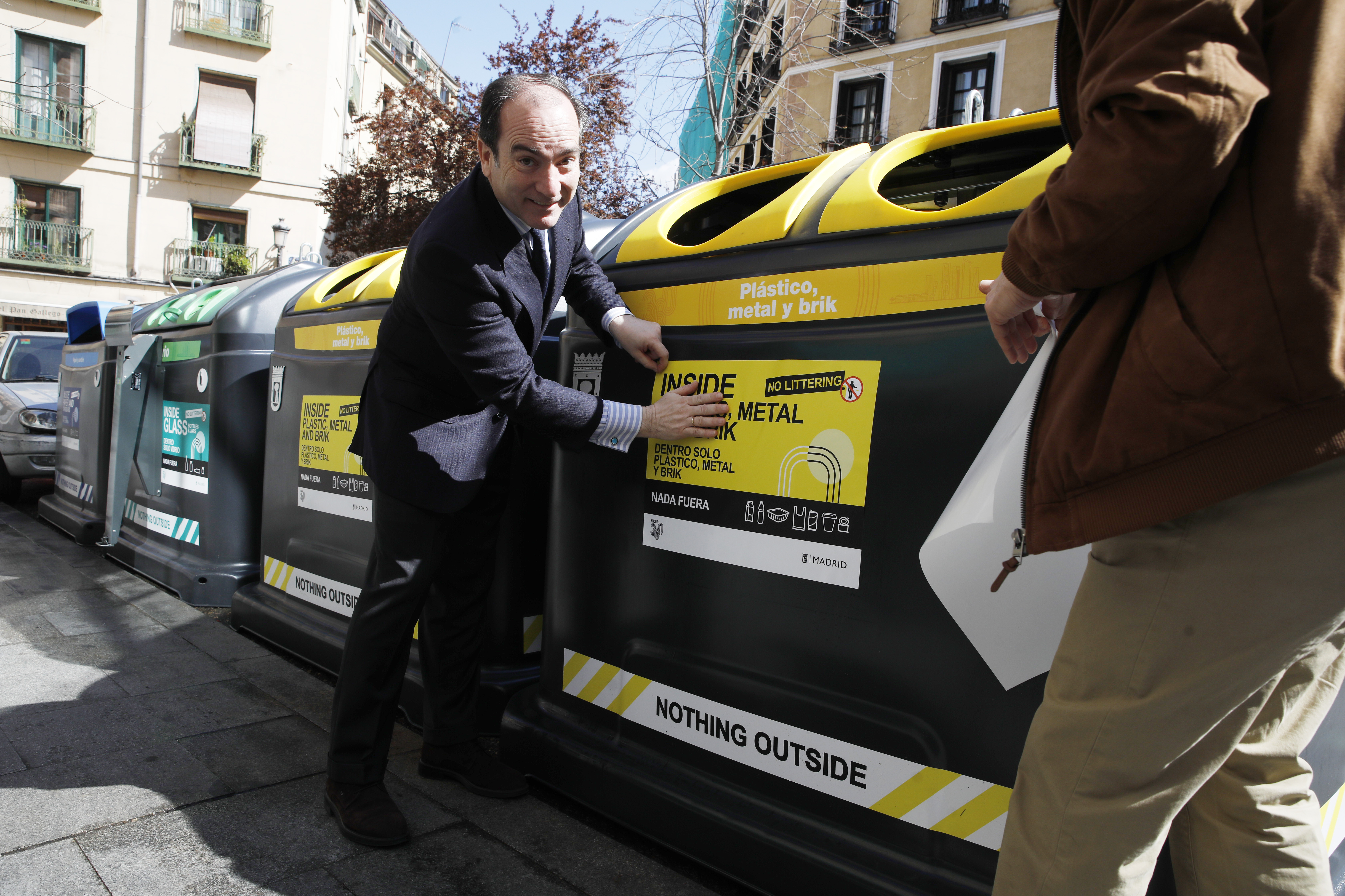 El Ayuntamiento de Madrid inicia una campaña piloto en el distrito de Centro para la concienciación sobre el depósito correcto de residuos con el objetivo de mantener limpia la ciudad. El delegado de Urbanismo, Medio Ambiente y Movilidad, Borja Carabante, ha visitado la plaza de Herradores, 7, en donde ha presenciado la colocación de la nueva cartelería, en castellano e inglés, en los contenedores de residuos de 20 puntos conflictivos del distrito.