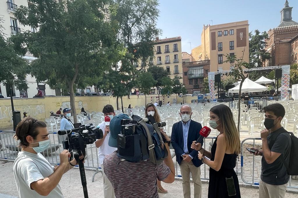 José Fernández, concejal del distrito de Centro, ha comprobado esta mañana en Las Vistillas la organización de las actividades previstas para este fin de semana, cuando la conmemoración de La Paloma pone punto final a seis días de celebraciones por San Cayetano, San Lorenzo y la Paloma. Tras el confinamiento del pasado año y con las restricciones obligadas por la actual situación sanitaria, Centro ha vuelto a revivir su espíritu más singular, castizo y madrileño. Por eso las celebraciones tienen control de aforo y para participar en ellas se requiere inscripción previa.