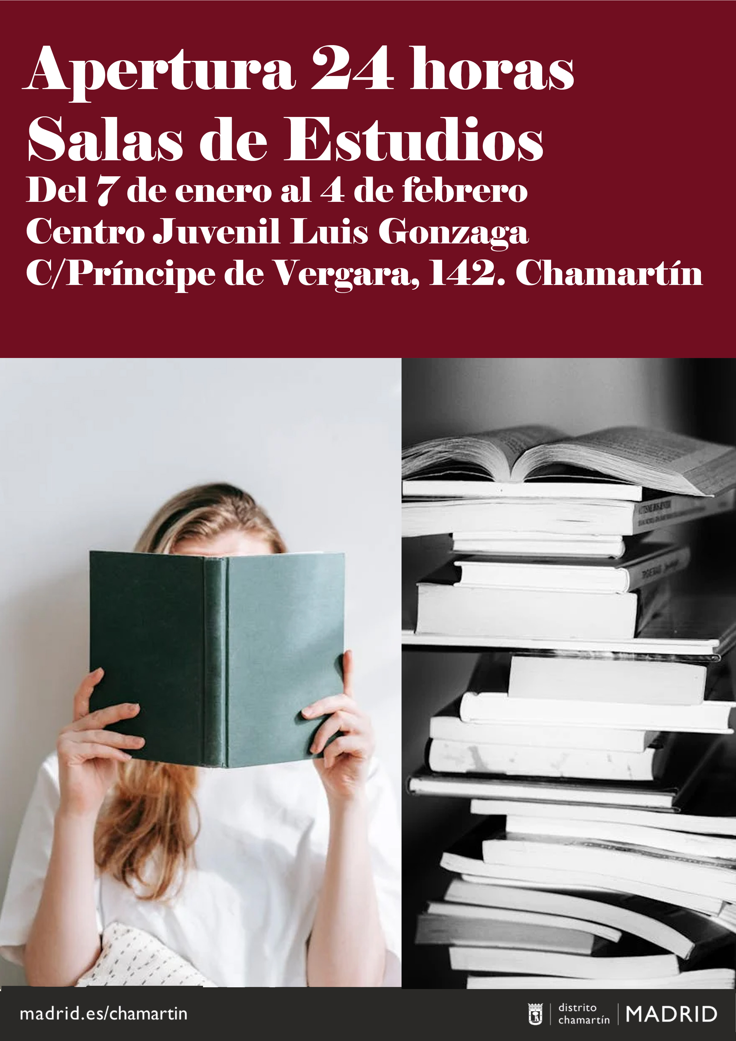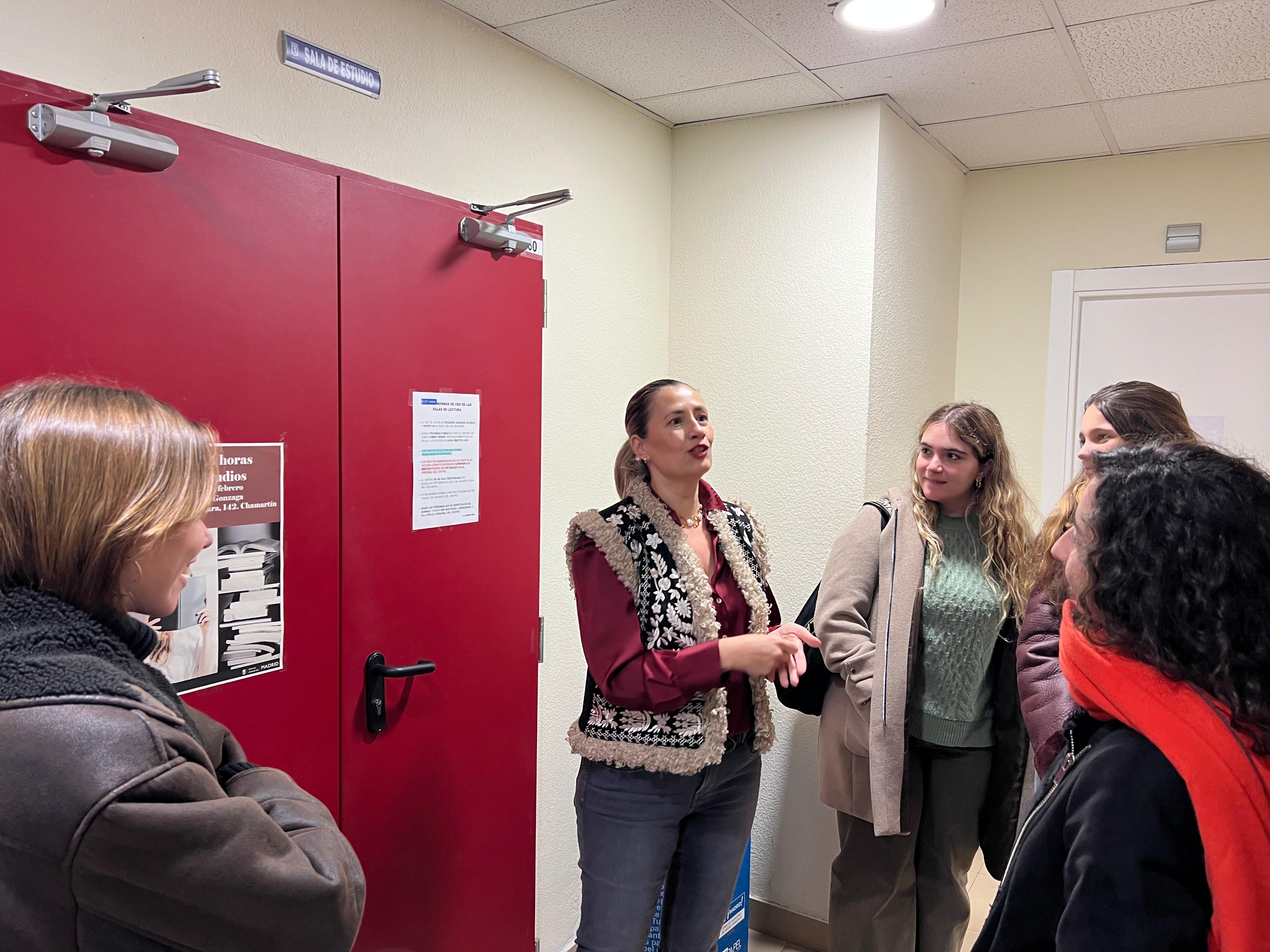 La concejala de Chamartín, Yolanda Estrada, ha visitado el Centro Juvenil Luis Gonzaga con motivo de la apertura las 24 horas de todos los días de la semana de dos salas para que, hasta el 4 de febrero, los estudiantes universitarios puedan preparar los exámenes del trimestre. Ubicado en la altura del número 142 de la calle del Príncipe de Vergara, el centro dispone de dos salas de estudio en la 6ª y la 7ª planta que ofertan cada una de ellas 48 puestos, 96 plazas en total.