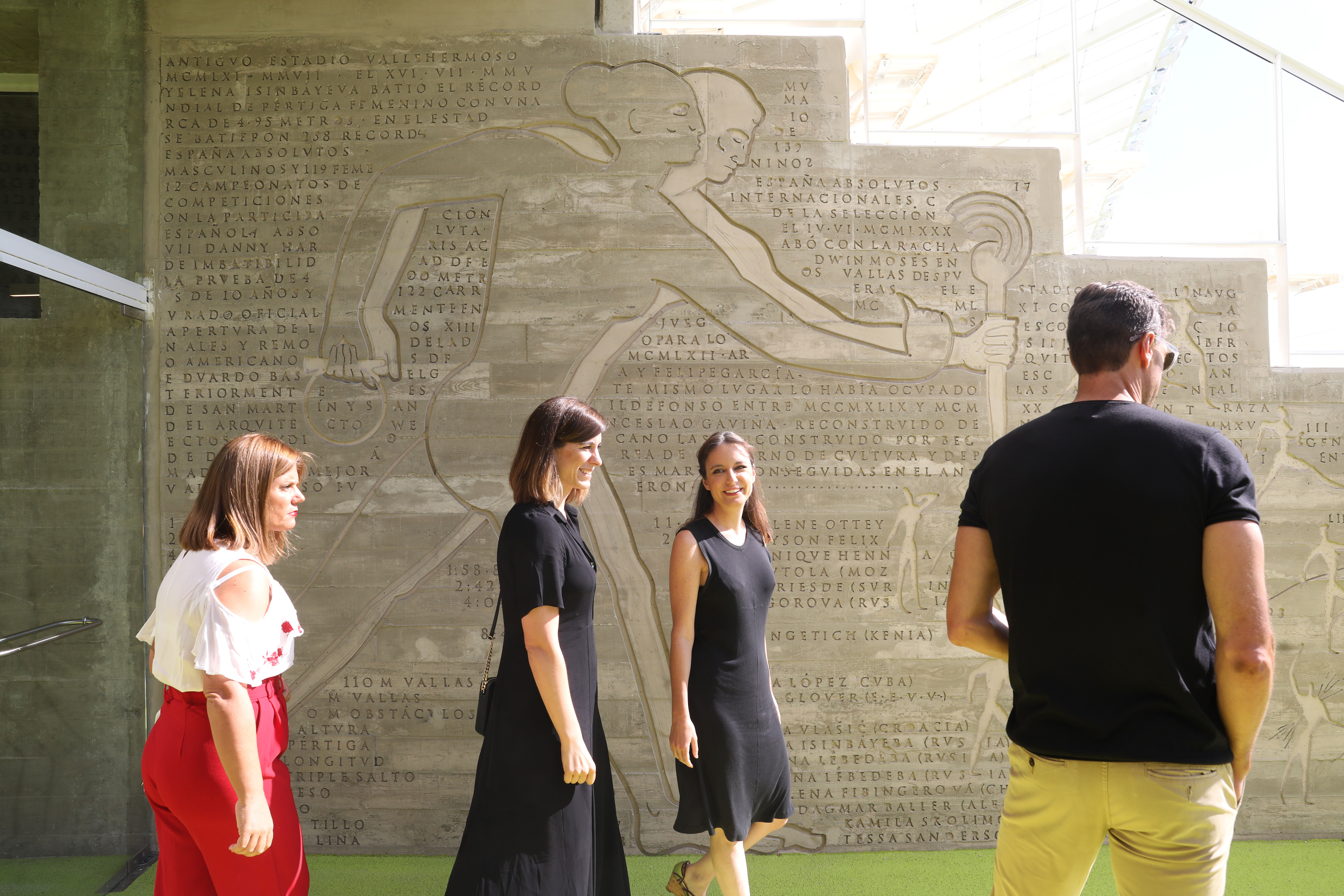 Una de las paradas de la visita ha sido la pista, que tiene curvas de un solo radio de 36,5 metros y pavimentación con material sintético con Certificado de Homologación 1 de la IAAF de primera calidad; así como la recta de 110 metros con nueve calles y dos colas sobresaliendo del anillo, y la ‘calle 10’ de césped artificial (exterior al anillo de la pista) para rodadores de fondo. La instalación dispone además de los pasillos dobles para concurso de saltos, pasillos y círculos de lanzamientos y demás equipamientos para la práctica de la competición de atletismo al aire libre, sobre un campo interior de césped natural.