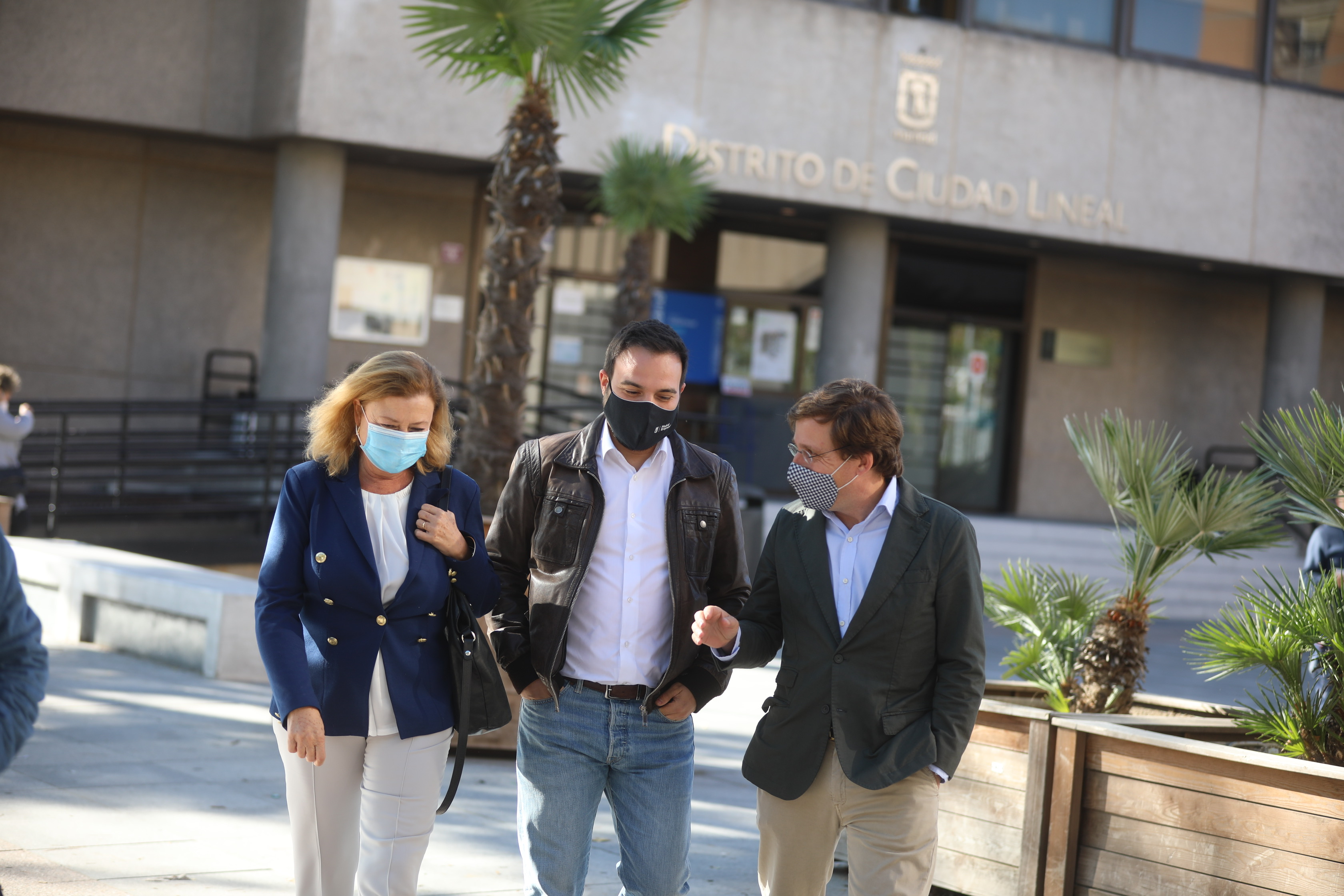Tras comprobar el avance de los trabajos, el alcalde ha visitado las dependencias de la Junta Municipal de Ciudad Lineal para analizar la situación del distrito tras la adopción de nuevas medidas sanitarias por parte del Gobierno regional./