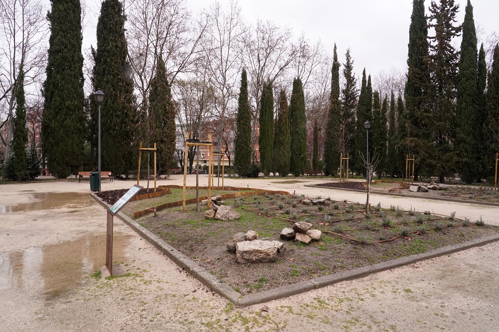 En el parque de la Almudena, se ha llevado a cabo laplantación de Tamarix africana, una especie adecuada para la regeneración ecológica. Además, se han construido muros de biodiversidad para albergar fauna urbana, se han instalado refugios para insectos y aves y se han reconvertido parterres en praderas biodiversas, mejorando la calidad del suelo y favoreciendo la polinización.
