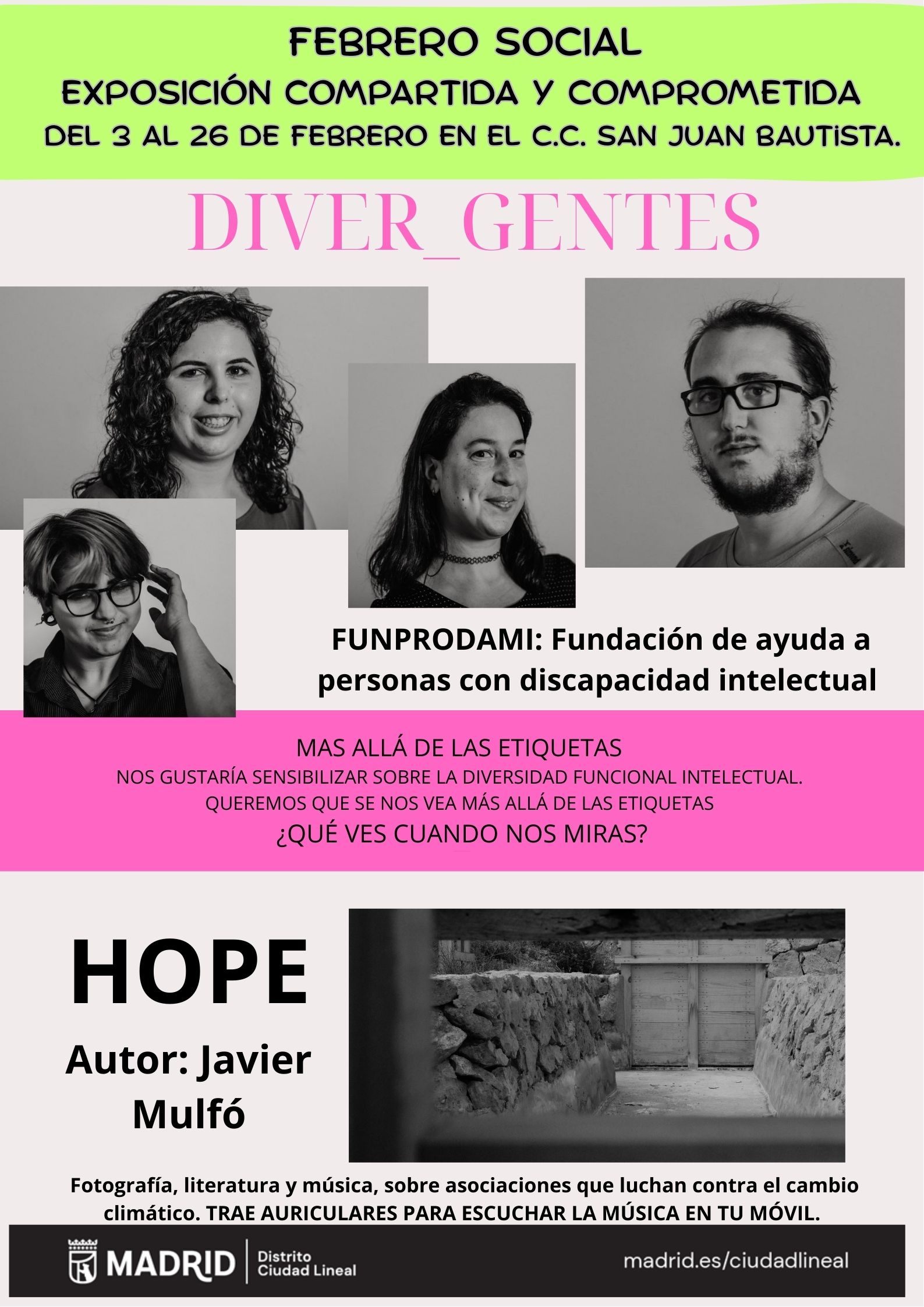 Exposición DIVER-GENTE (Fundación PRODAMI) y HOPE (Javier Mulfó)Del martes 3 de febrero de 2026 al jueves 26 de febrero de 2026