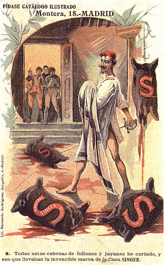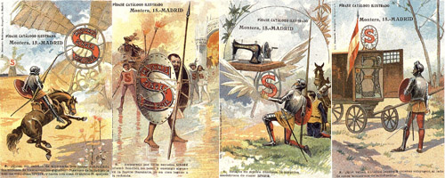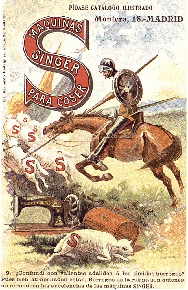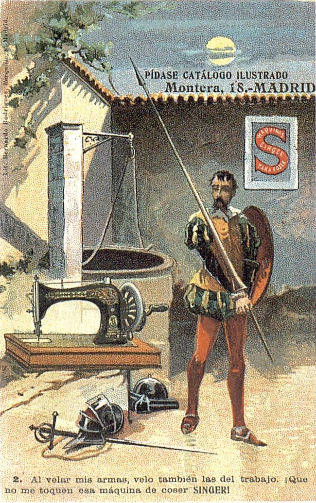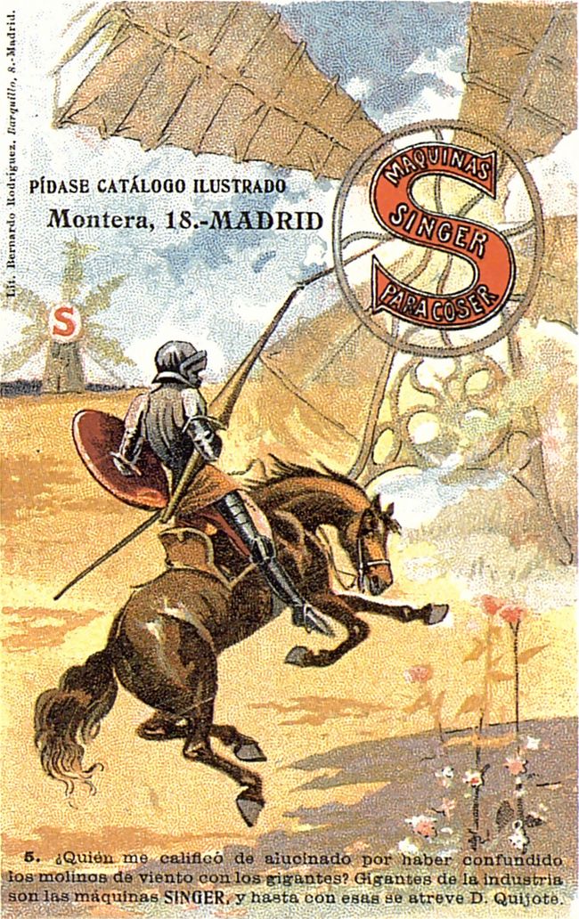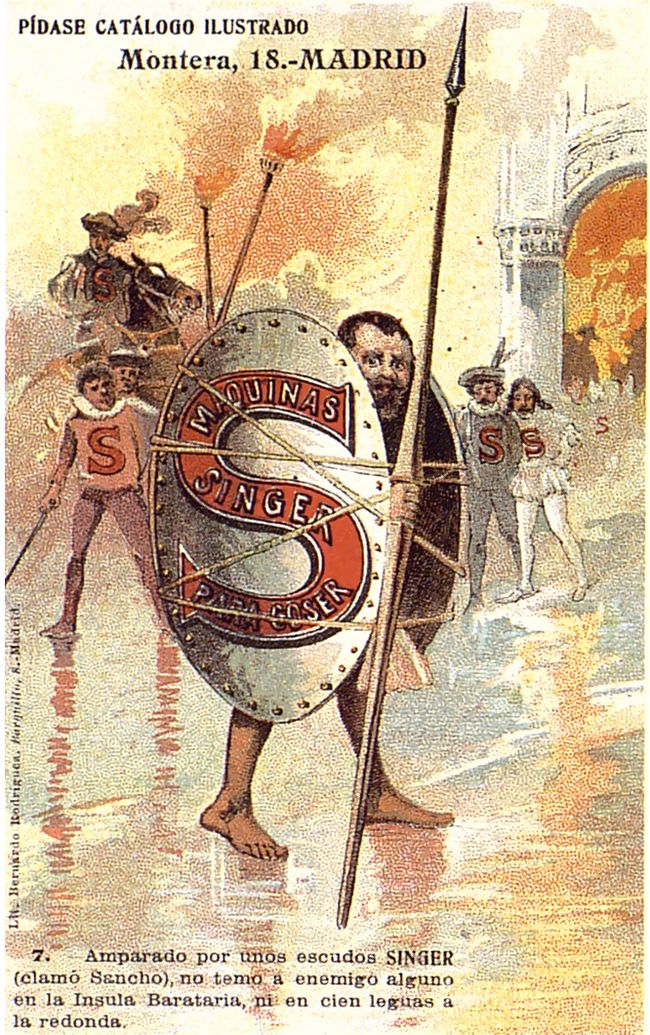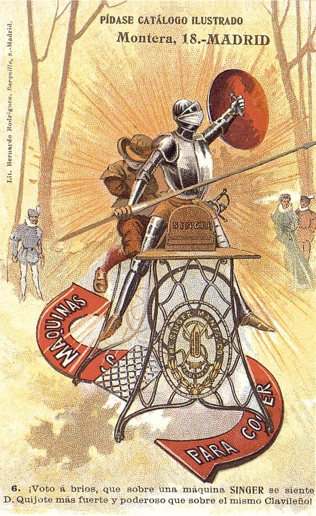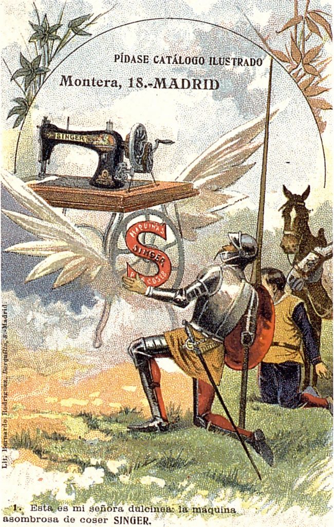 La casa Singer de máquinas de coser aprovechó la figura del Quijote para publicitar sus productos a través de estas 10 tarjetas postales. En cada una de ellas se reproduce una escena del libro en las que se incluye una máquina de coser Singer.