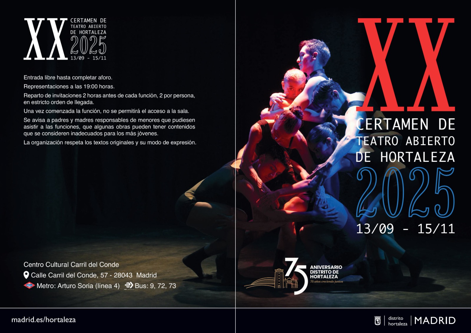 El distrito de Hortaleza acoge un año más el Certamen de Teatro Abierto que, en su XX edición, se ha convertido en un referente cultural de la capital para acercar las propuestas teatrales de compañías aficionadas a todos los madrileños. El ciclo arranca este sábado, 13 de septiembre, con la comedia Prisa, prisa! de Entrenorteysur Producciones, y bajará el telón el próximo 11 de noviembre con Escapadas, de la Asociación Cultural Divinas…de la Muerte.