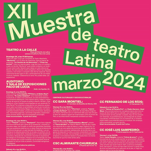 La plaza Distrito Latina acogerá ‘Un fiestón de mil demonios’ como antesala al Día Mundial del TeatroDiferentes espacios culturales municipales del distrito acogen durante el mes de marzo la XII Muestra de Teatro de Latina, que concluirá con la función de teatro de calle de la compañía Morboria, Un fiestón de mil demonios o Vivan los novios, como antesala al Día Mundial del Teatro. En el cartel destaca otra veterana compañía, Yllana Teatro, también fiel a la muestra organizada por la Junta Municipal de Latina, que llevará al Auditorio Paco de Lucía su divertido espectáculo Passport. A lo largo de marzo llegan más de una decena de obras a los centros culturales del distrito, con funciones de libre acceso.