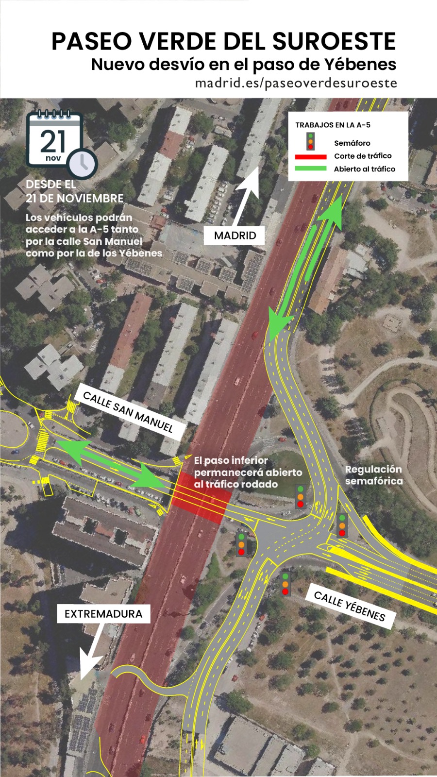 Para garantizar la continuidad de la movilidad local y la seguridad vial durante la ejecución de las obras ha sido necesario implantar un giro a la izquierda que permitirá la incorporación desde la calle de Yébenes a la A-5 en sentido Badajoz, así como la adaptación de la regulación semafórica en el cruce principal (calle de Yébenes-San Manuel-A5).