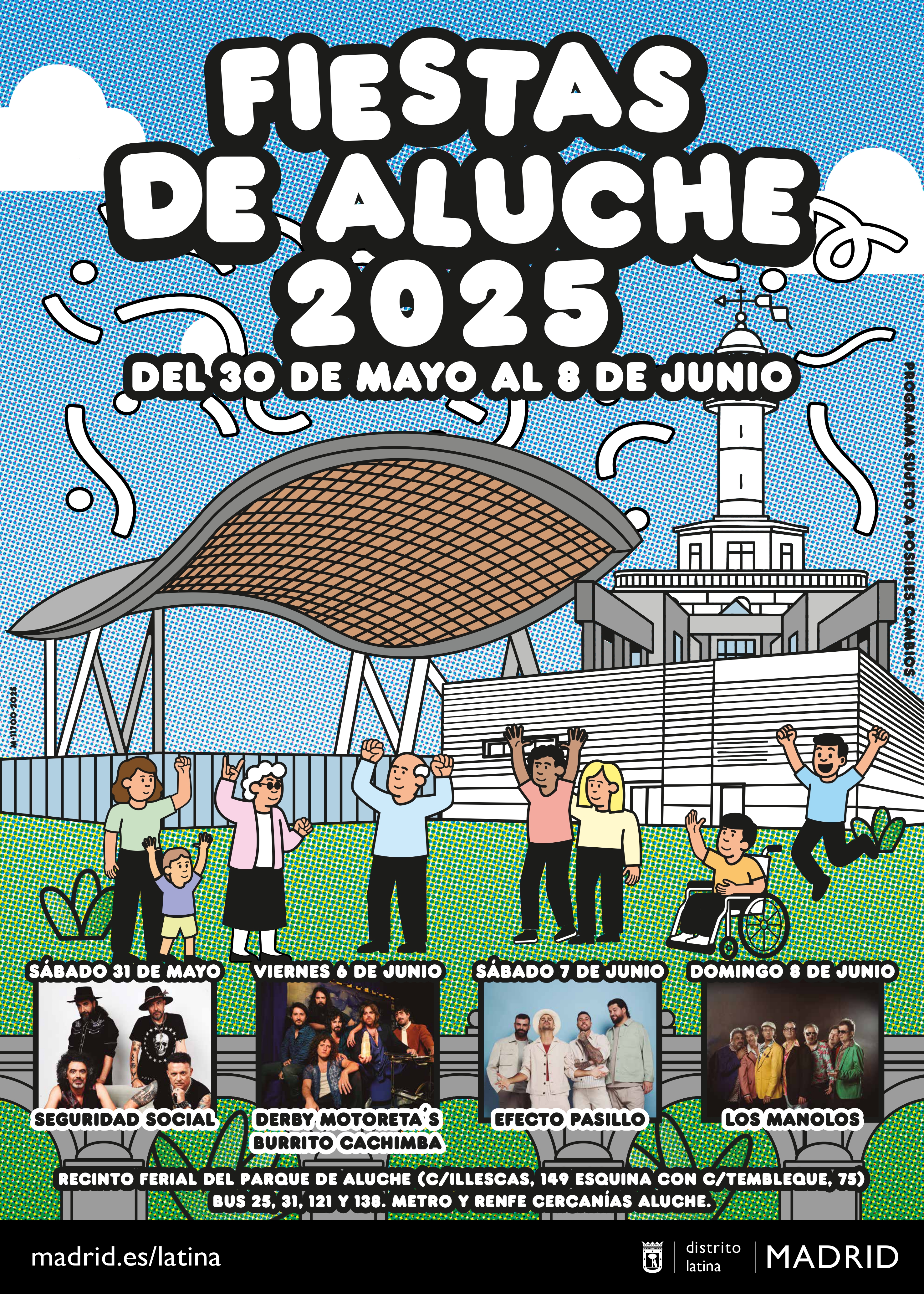 Las fiestas del barrio de Aluche, en el distrito de Latina, se celebrarán este año del 31 de mayo al 8 de junio en el ya tradicional recinto ferial del parque de Aluche, calle de Illescas, esquina con calle del Tembleque. Este recinto se convertirá en el escenario para los grupos Seguridad Social, Derby Motoreta´s Burrito Cachimba, Efecto Pasillo y Los Manolos que protagonizan el cartel musical de esta edición.