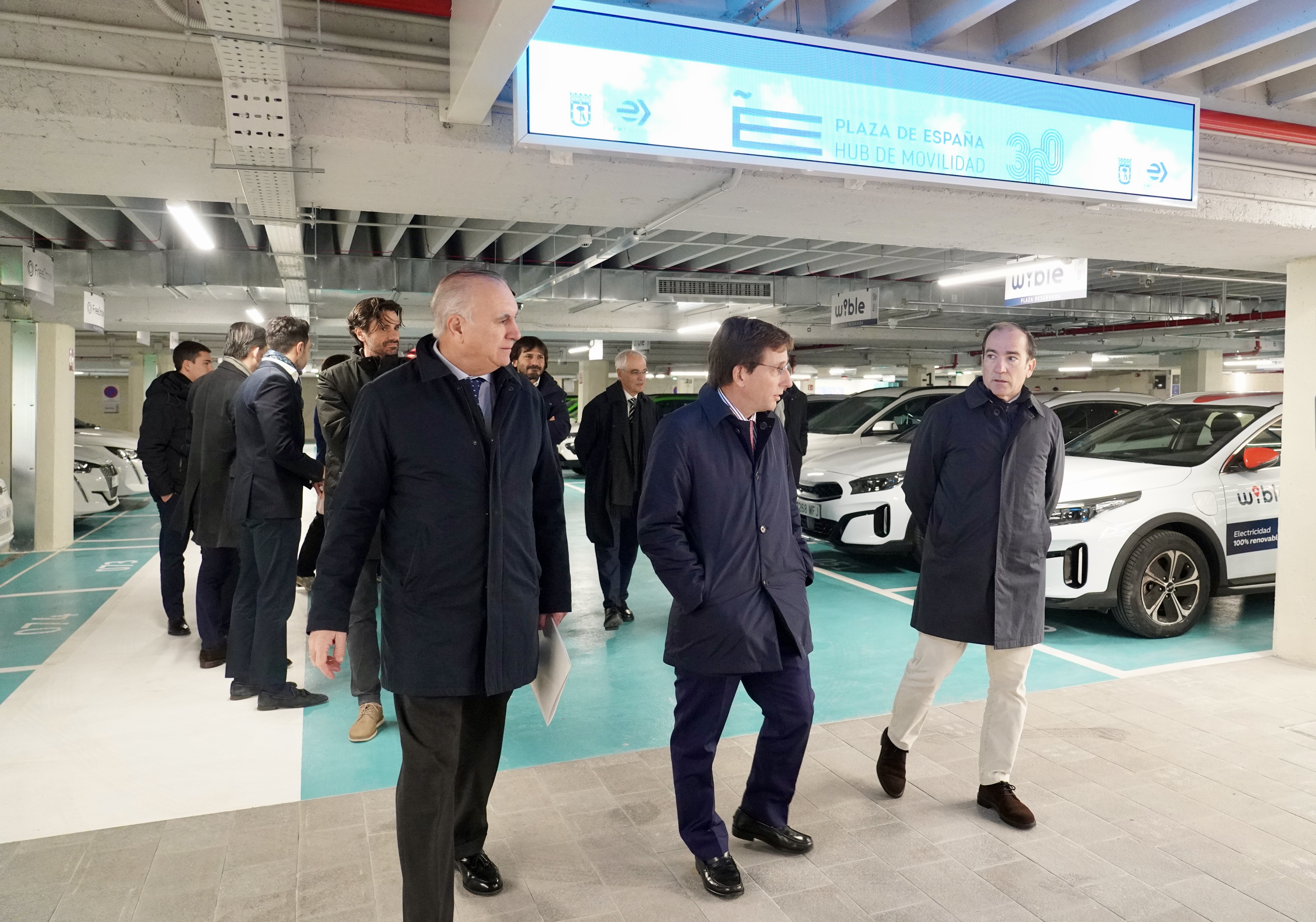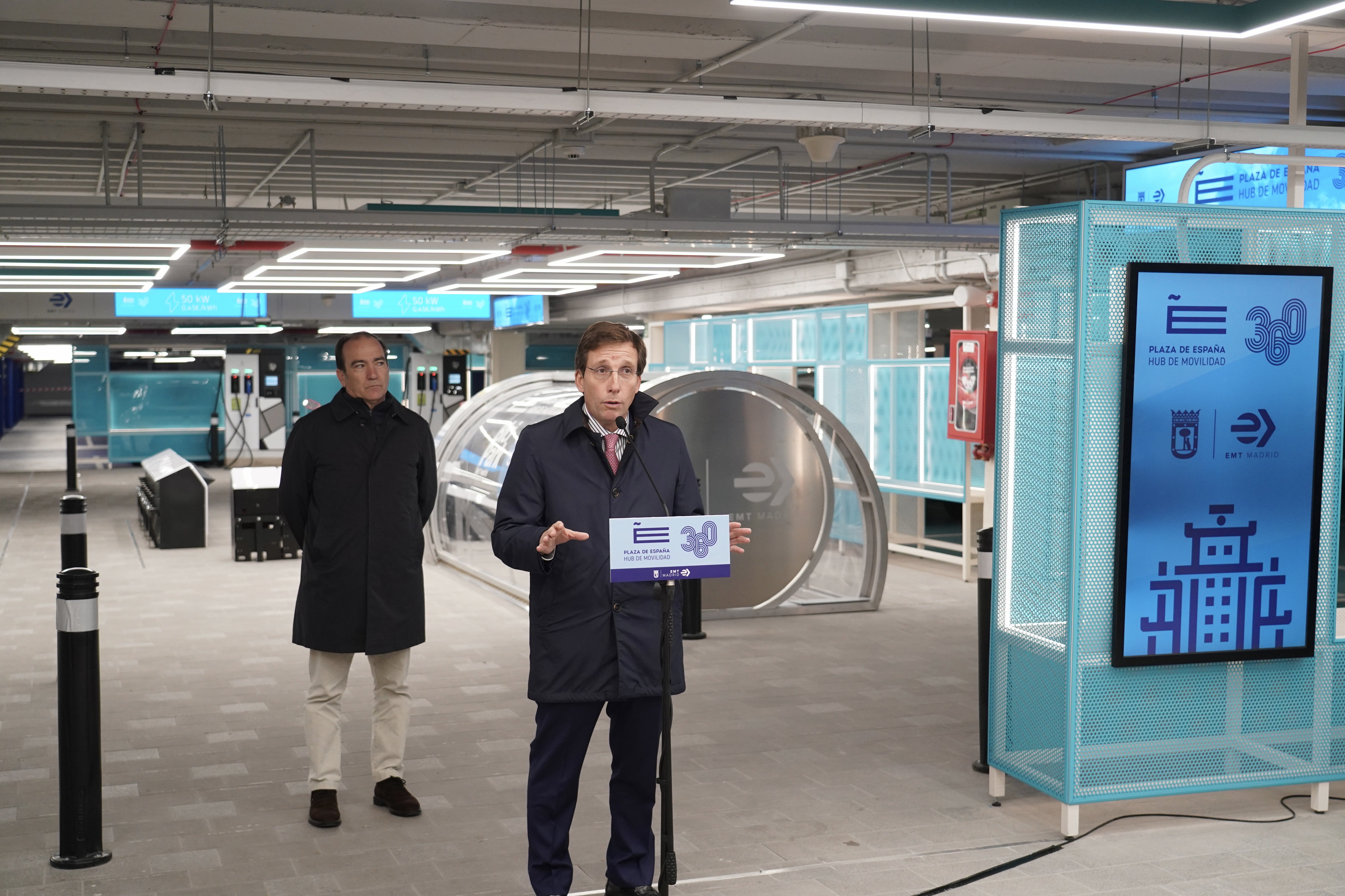 El alcalde de Madrid, José Luis Martínez-Almeida, ha visitado esta mañana el nuevo hub de movilidad sostenible Plaza de España 360, gestionado por la Empresa Municipal de Transportes de Madrid (EMT Madrid), tras las obras de adecuación ejecutadas en las instalaciones del antiguo aparcamiento subterráneo.
