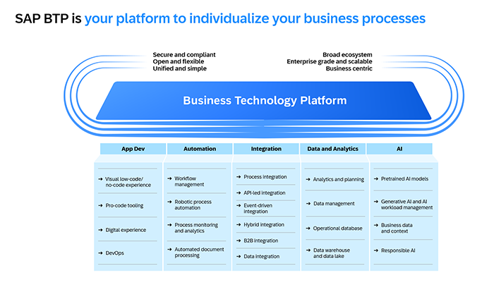 Cabe destacar que RISE with SAP no es solo «ERP en la nube», sino una propuesta más amplia que incluye varios componentes pensados para impulsar los organismos inteligentes. Entre estos componentes, uno de los más importantes es SAP Business Technology Platform (BTP). De hecho, SAP describe a BTP como «la base del modelo de organismo inteligente» dentro de la oferta RISE. SAP BTP es una plataforma como servicio (PaaS) empresarial que ofrece un abanico completo de herramientas y servicios para desarrollar, ampliar e integrar aplicaciones en la nube… posicionándose como un pilar fundamental para la transformación digital de los negocios basados en las funcionalidades gestionadas por SAP. Es decir, BTP permite al Ayuntamiento crear aplicaciones a medida (por ejemplo, un portal ciudadano personalizado, una app móvil para empleados, etc.), conectar SAP con otros sistemas externos (por ejemplo, enlazar los datos financieros municipales con plataformas estatales o con soluciones de smart city), y aprovechar servicios avanzados de SAP en la nube (analítica de datos, machine learning, Internet de las Cosas, blockchain, chatbots, etcétera) sin tener que construir toda la infraestructura desde cero.