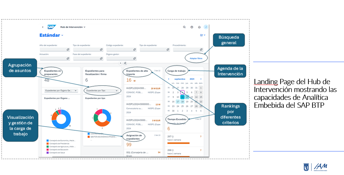 - Análisis de datos avanzado: SAP BTP incluye soluciones analíticas y de datos, como SAP Analytics Cloud (SAC) para la visualización y reporting avanzado. Así, por ejemplo, en el “HUB de Intervención”, que previsiblemente estará disponible a final de este año, la primera pantalla con la que se encontrará el usuario es la pantalla con un resumen gráfico de las tareas de intervención que son de su responsabilidad. Todo en una misma pantalla interactiva. Estas correlaciones de datos facilitan políticas basadas en evidencia. Además, con las capacidades de machine learning, se podría prever el comportamiento de ciertos indicadores y hacer simulaciones. En definitiva, BTP habilita una gestión más inteligente y proactiva del Ayuntamiento a partir de los datos.