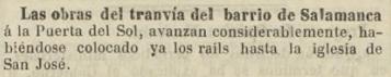 En 1877 se inaugura la segunda línea de tranvía desde la Plaza Mayor hasta el puente de Toledo que posteriormente se ampliará a los Carabancheles. Nuevas líneas surgirán poco a poco enlazando barrios como Cuatro Caminos, las Ventas, Embajadores, Prosperidad, Chamberí o las Ventas con el centro de Madrid, principalmente con la Puerta del Sol que se convierte en centro neurálgico.