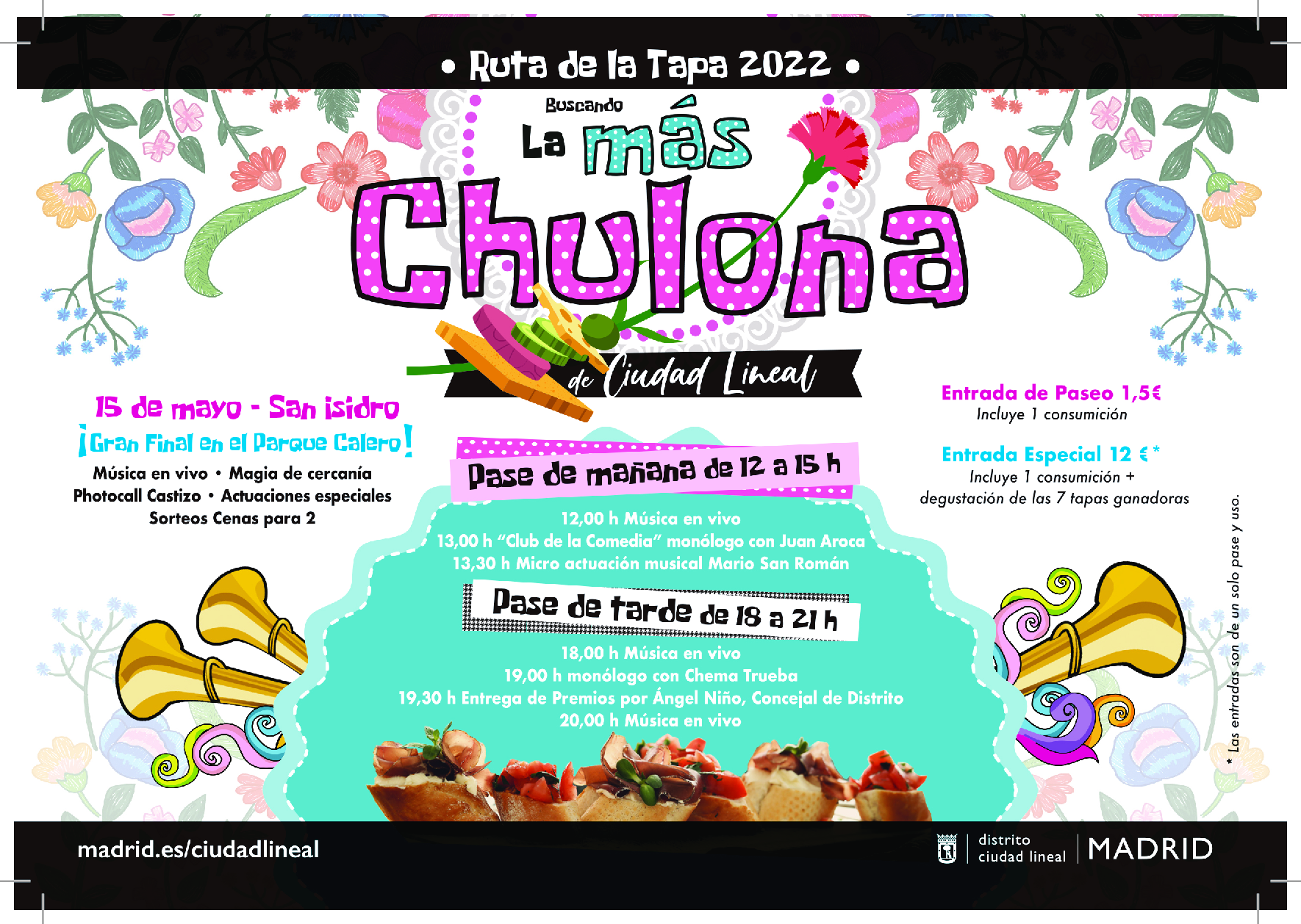 La final de la Ruta de la Tapa está cada vez más cerca. Este domingo se dará a conocer ‘la tapa más chulona’ de Ciudad Lineal con una gran fiesta en el auditorio del parque El Calero. Entran a concurso las siete tapas ganadoras de los barrios participantes en la ruta (Colina, Costillares, San Pascual, Concepción, Ventas, Pueblo Nuevo y Quintana), que podrán ser degustadas por los vecinos en una jornada festiva que contará con música en vivo, monólogos y actuaciones de magia.