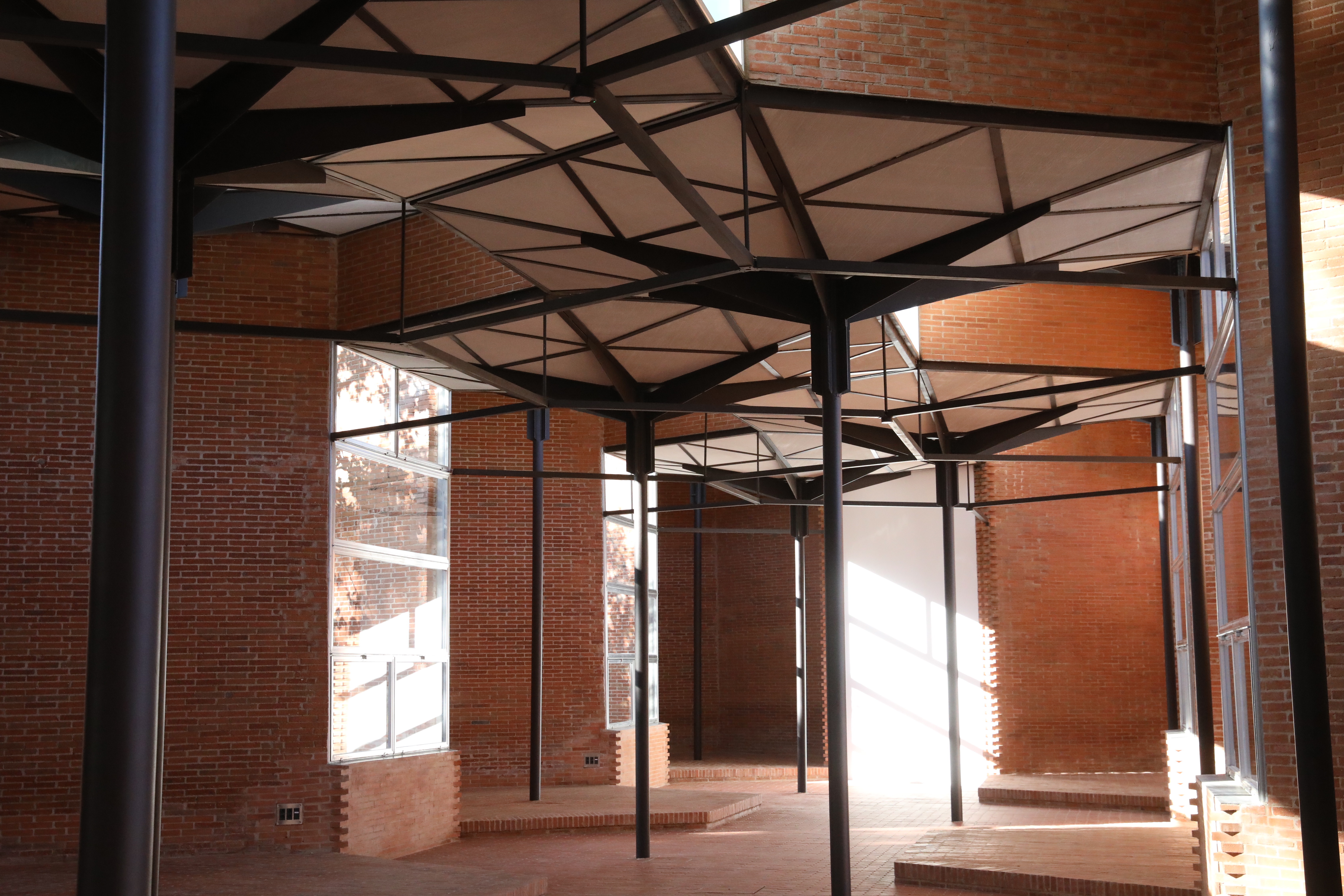 Este espacio se configura mediante un elemento estructural, el hexágono, que recoge el agua de lluvia, sustentado por un fuste que facilita la evacuación del agua a una curiosa arqueta que es a la vez cimentación y de ahí es conducida a la red de saneamiento. Esta estructura a modo de paraguas invertidos, su repetición y juego de alturas y niveles constituye un modelo perfecto de la arquitectura modular y un paradigma para la arquitectura moderna española, construida con muy pocos materiales: acero, vidrio, aluminio y ladrillo.