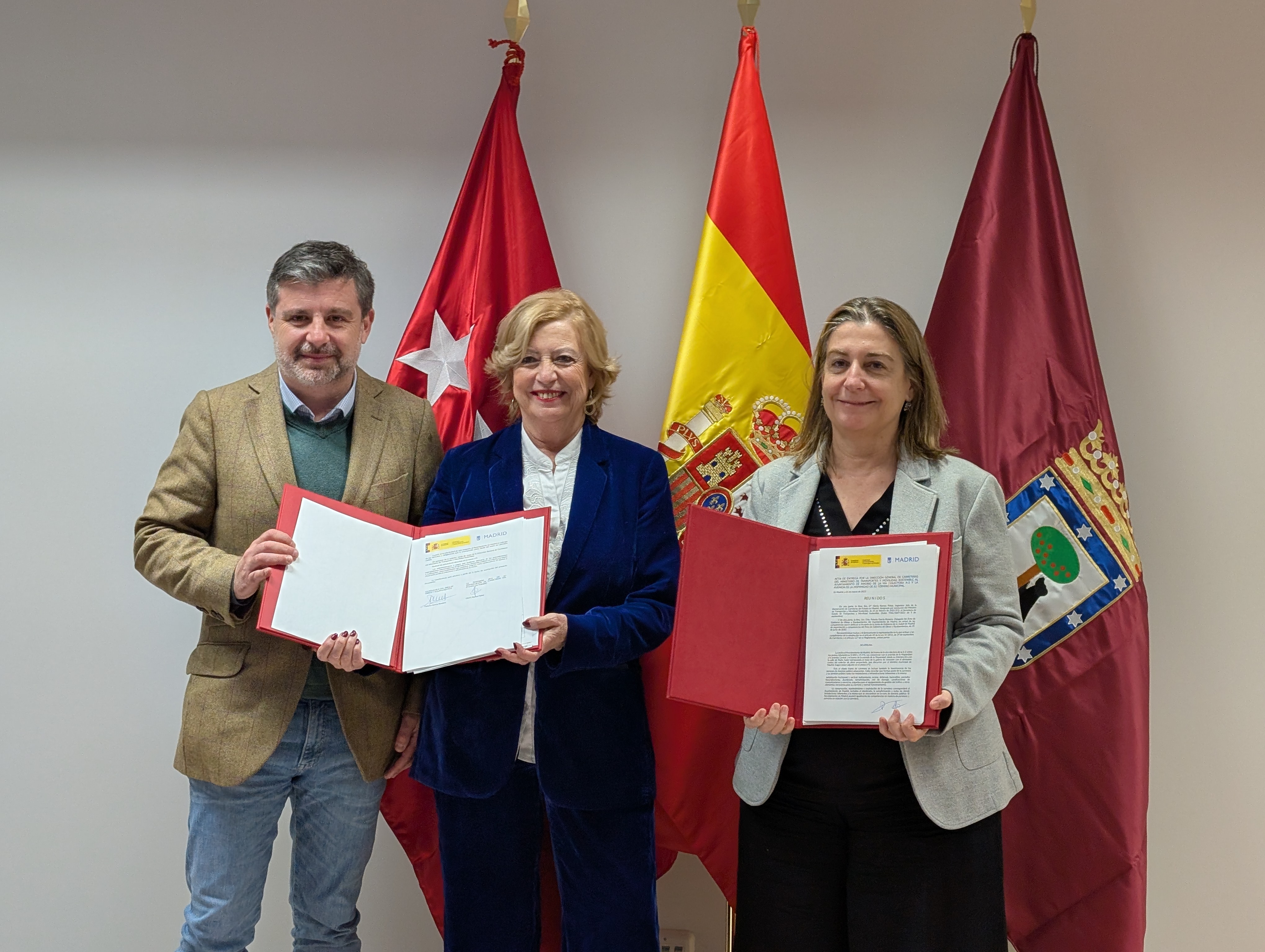 La delegada de Obras y Equipamientos, Paloma García Romero, y la ingeniera jefa de la Demarcación de Carreteras del Estado en Madrid, Gloria Ramos, han firmado esta mañana el acta de cesión al Ayuntamiento de Madrid por parte del Ministerio de Transportes y Movilidad Sostenible del tramo de la vía colectora de la A-2 comprendida entre los puntos kilométricos 0+000 y 3+773, sus conexiones con la avenida de la Hispanidad y la avenida Central y el tramo de la avenida de la Hispanidad desde su intersección con la calle de Riaño hasta sobrepasada la traza de la galería de conexión con el aliviadero del futuro colector proyectado.