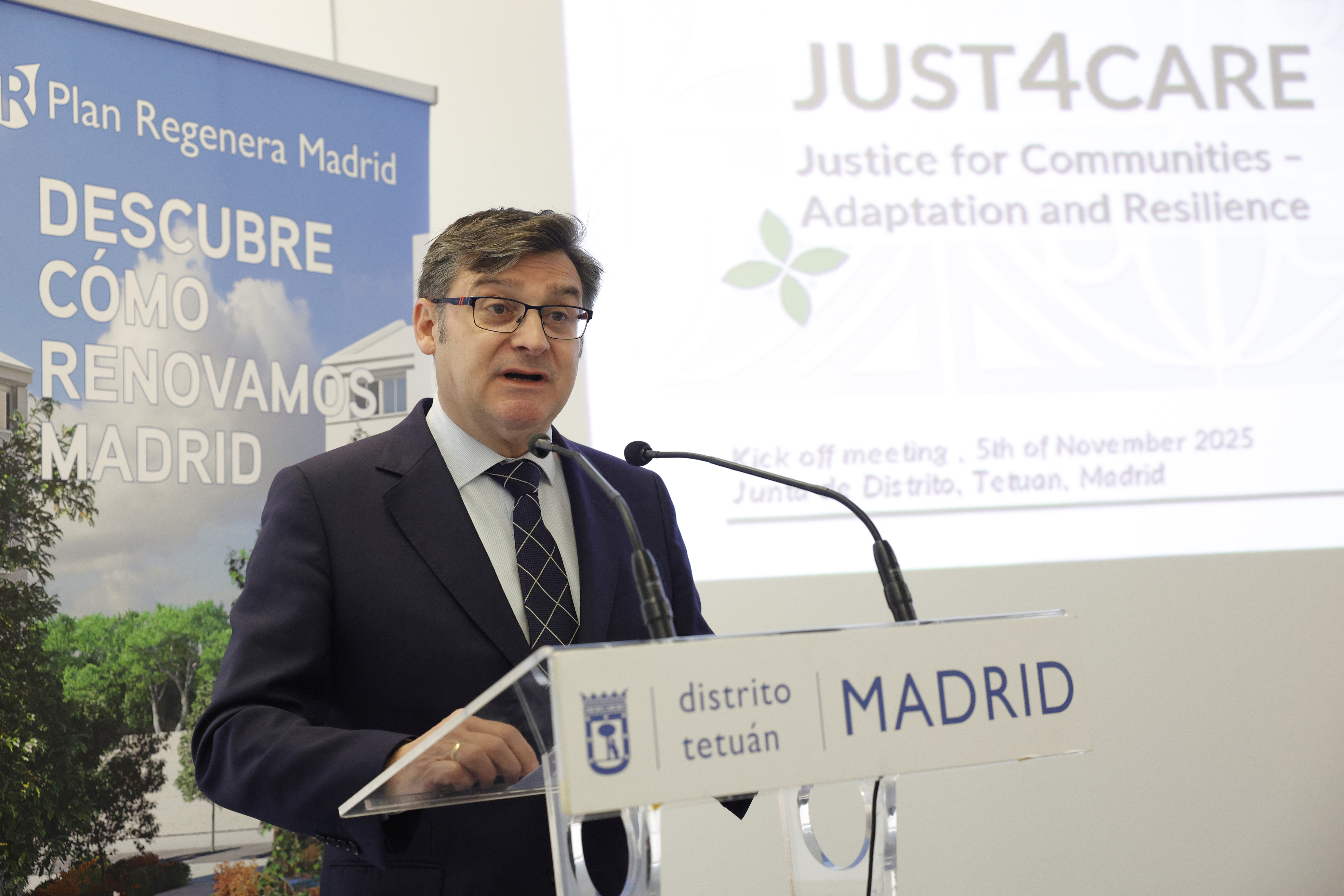 El delegado de Políticas de Vivienda y presidente de la Empresa Municipal de la Vivienda y Suelo (EMVS Madrid), Álvaro González, acompañado por la concejala de Tetuán, Paula Gómez-Angulo, ha presidido hoy, en la junta municipal del distrito, el lanzamiento del proyecto europeo JUST4CARE, una iniciativa del programa Horizon Europe, dentro de la Misión de Adaptación al Cambio Climático, que busca impulsar la resiliencia urbana con un enfoque centrado en la justicia social y la equidad.