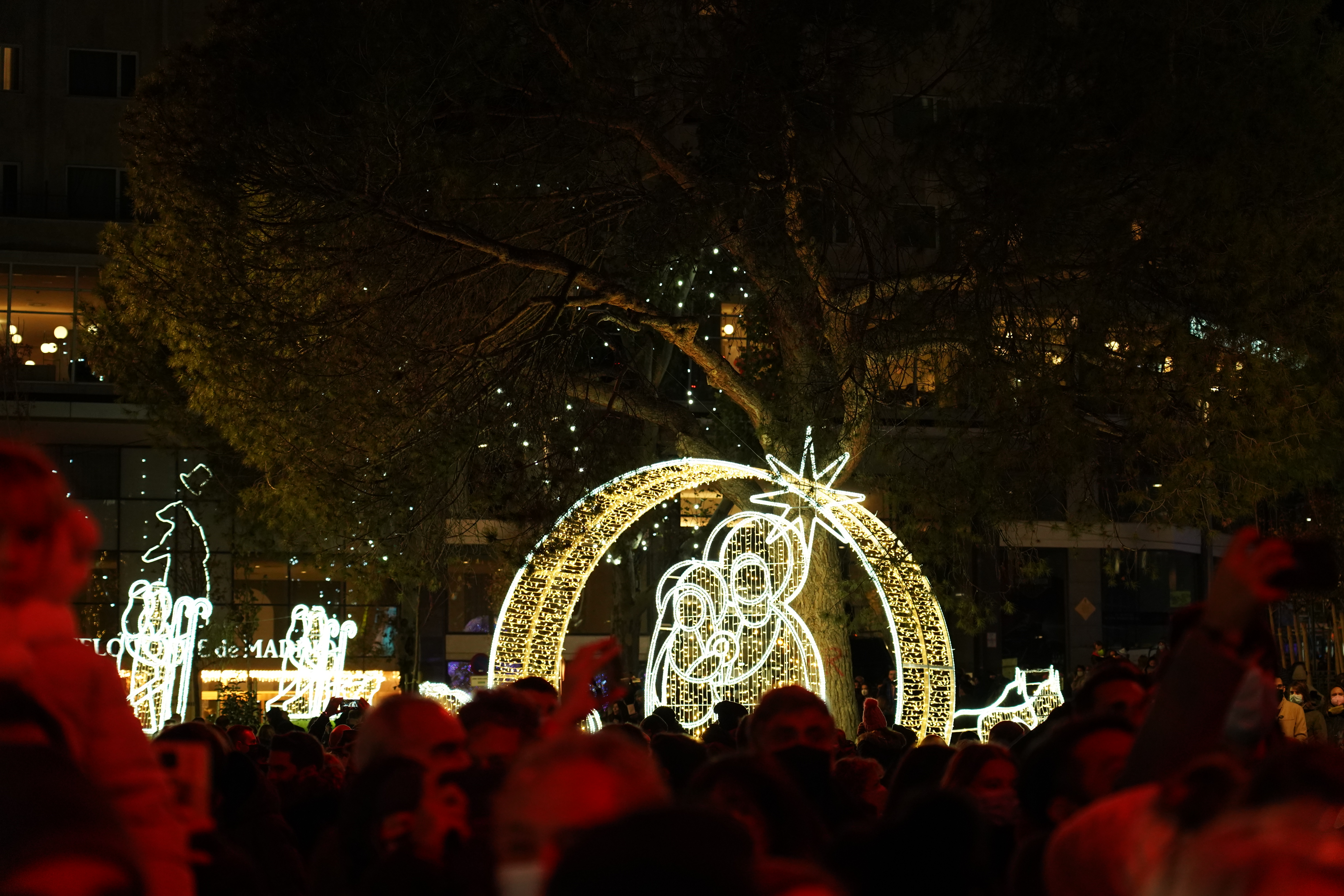- El escenario elegido ha sido la renovada plaza de España, que está presidida por un abeto natural de 18 metros y un belén luminoso gigante