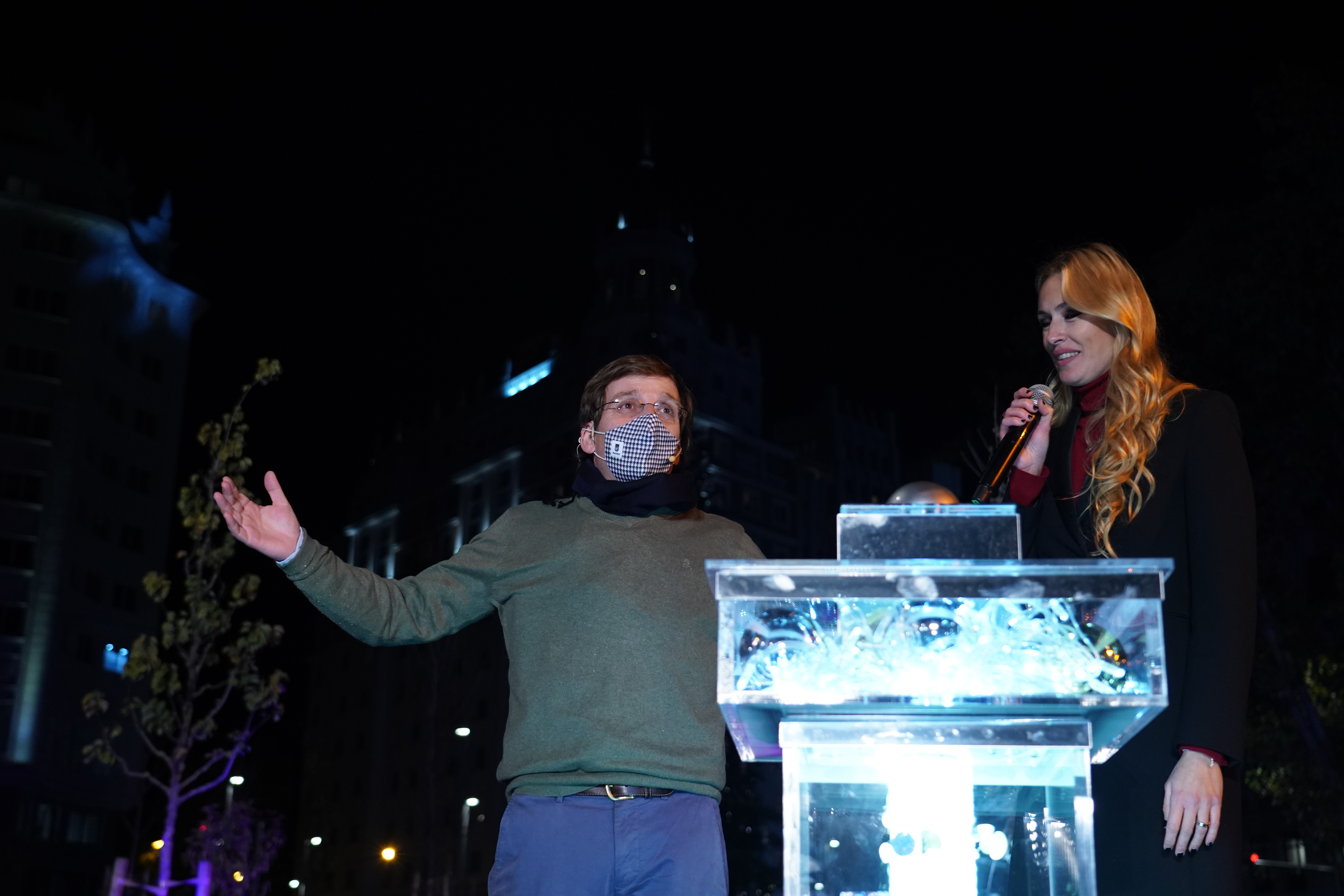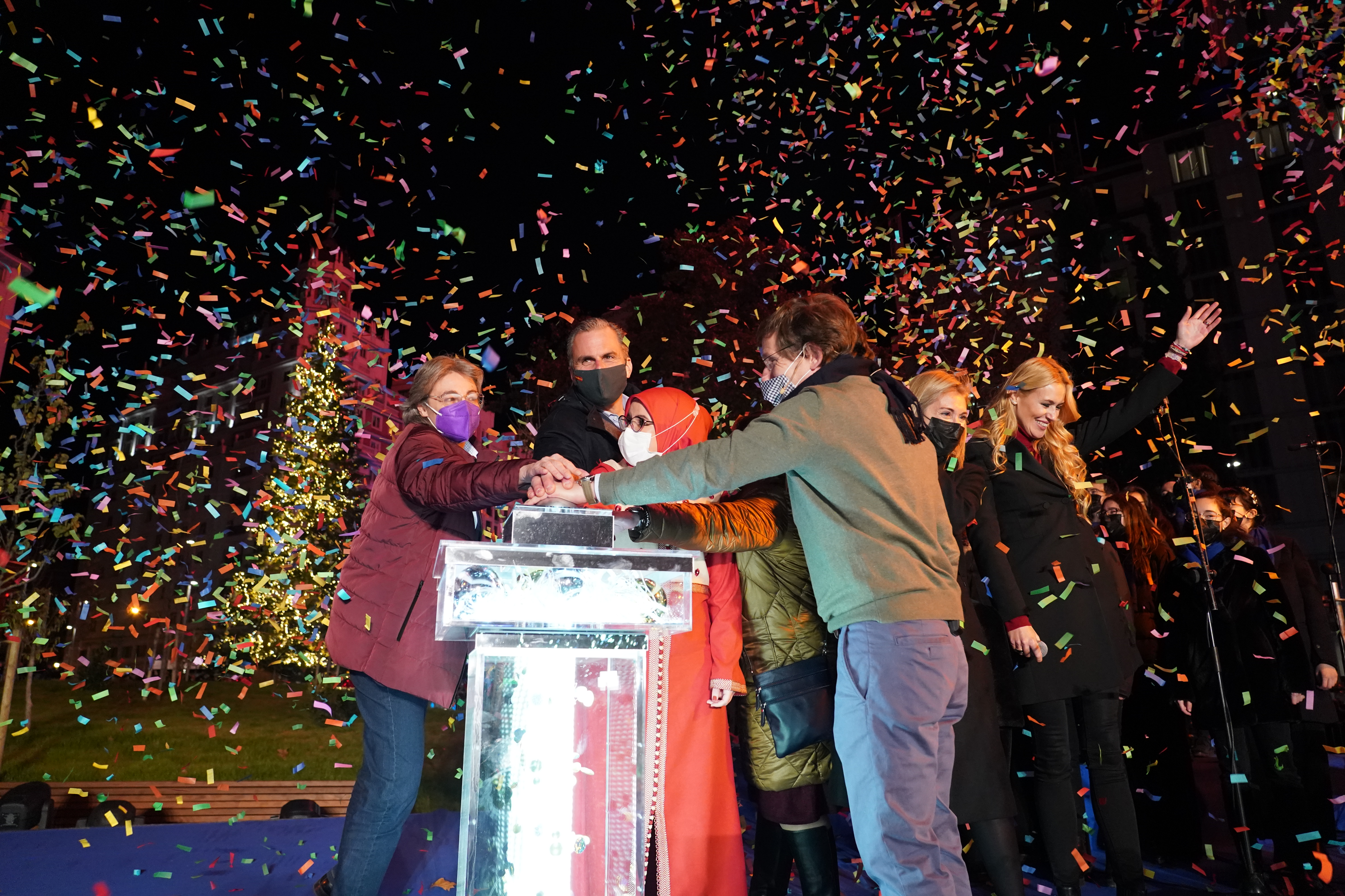 La renovada plaza de España ha sido escenario esta tarde del encendido de la iluminación navideña de Madrid, que se extenderá hasta el próximo 6 de enero. El alcalde, José Luis Martínez-Almeida, que ha estado acompañado por la delegada de Obras y Equipamientos, Paloma García Romero, y otros representantes del Gobierno municipal y de los grupos políticos, ha sido el encargado de accionar el pulsador que ha activado los 11 millones de bombillas led repartidas por toda la ciudad. Una explosión de luz que ha puesto el broche de oro a un acto que ha contado con las actuaciones de Anglada & Cerezuela y el Coro de Jóvenes de Madrid.