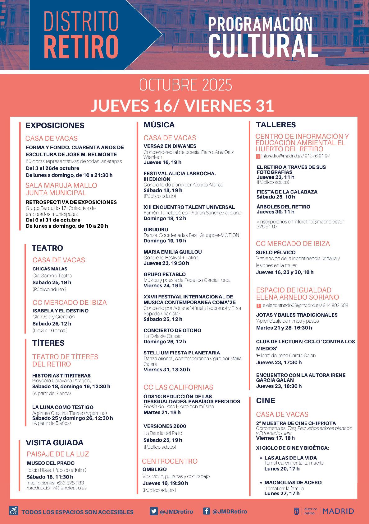 Estimados suscriptores, finalizamos este mes de octubre en el distrito con una nueva agenda cultural de actividades gratuitas para todos los gustos y edades. No os perdáis las exposiciones de escultura en Casa de Vacas y pintura de empleados municipales en la Sala Maruja Mallo de la Junta Municipal. Ofrecemos también una amplia y variada programación de actuaciones musicales, talleres de diversa índole, sesiones de teatro y ciclos de cine temáticos con debate posterior. Aprovechamos en esta ocasión para despedir esta revista no sin antes daros las gracias por vuestra fidelidad por estos años como suscriptores y anunciaros que a partir de noviembre podréis seguir la información cultural en esta misma web del distrito a través de los enlaces a los centros culturales de Retiro. Hasta siempre y recuerda que La cultura pasa en Retiro.