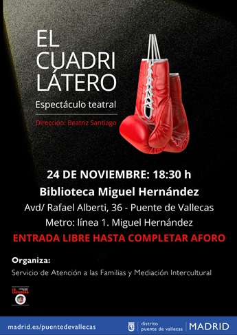 Desde el programa de Servicio de Atención a Familias y Mediación Intercultural (SAFMI) nos ofrecen una obra teatral enmarcada en el 25 N, Día Internacional de la Eliminación de la Violencia contra la Mujer: 'El cuadrilátero'. Perteneciente al laboratorio teatral 'Como me pone la lavadora'.