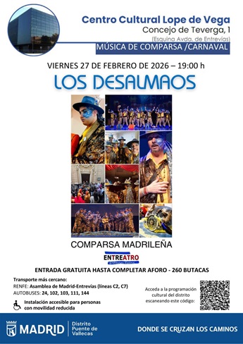 Para este 2026, la Comparsa Madrileña presenta a 'Los desalmados'. Nos coloca en la piel de este personaje sin alma, divertido y sinvergüenza. La actuación consta de una primera parte compuesta por una presentación, dos pasodobles, dos cuplés y un popurrí y luego “tira” de coplas de autor, coplas gaditanas y demás repertorio… una fiesta.