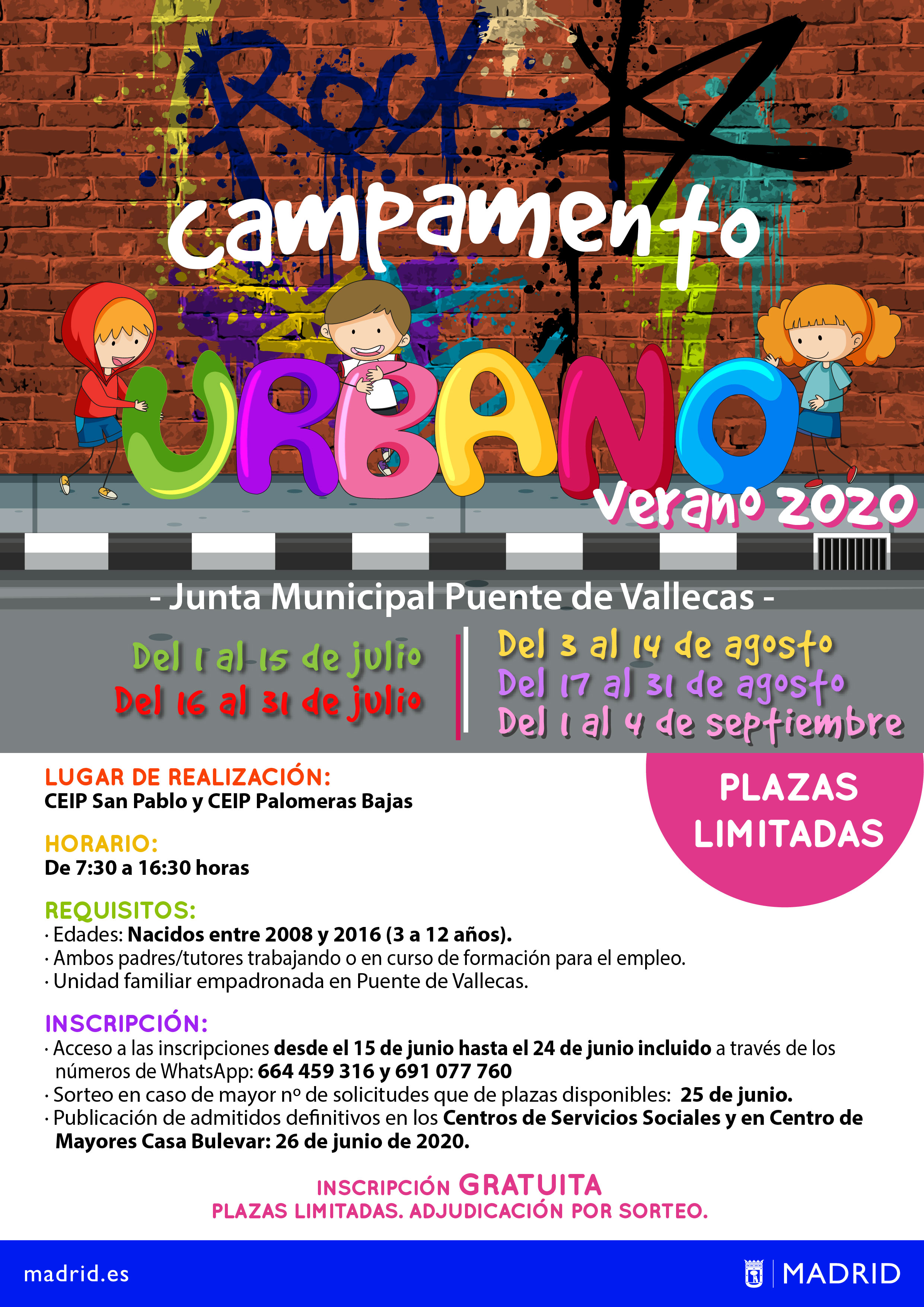El distrito de Puente de Vallecas ha abierto el proceso de inscripción para el campamento urbano de verano, que se celebrará en los CEIP San Pablo y Palomeras Bajas, de 7:30 h a 16:30 h, de lunes a viernes.