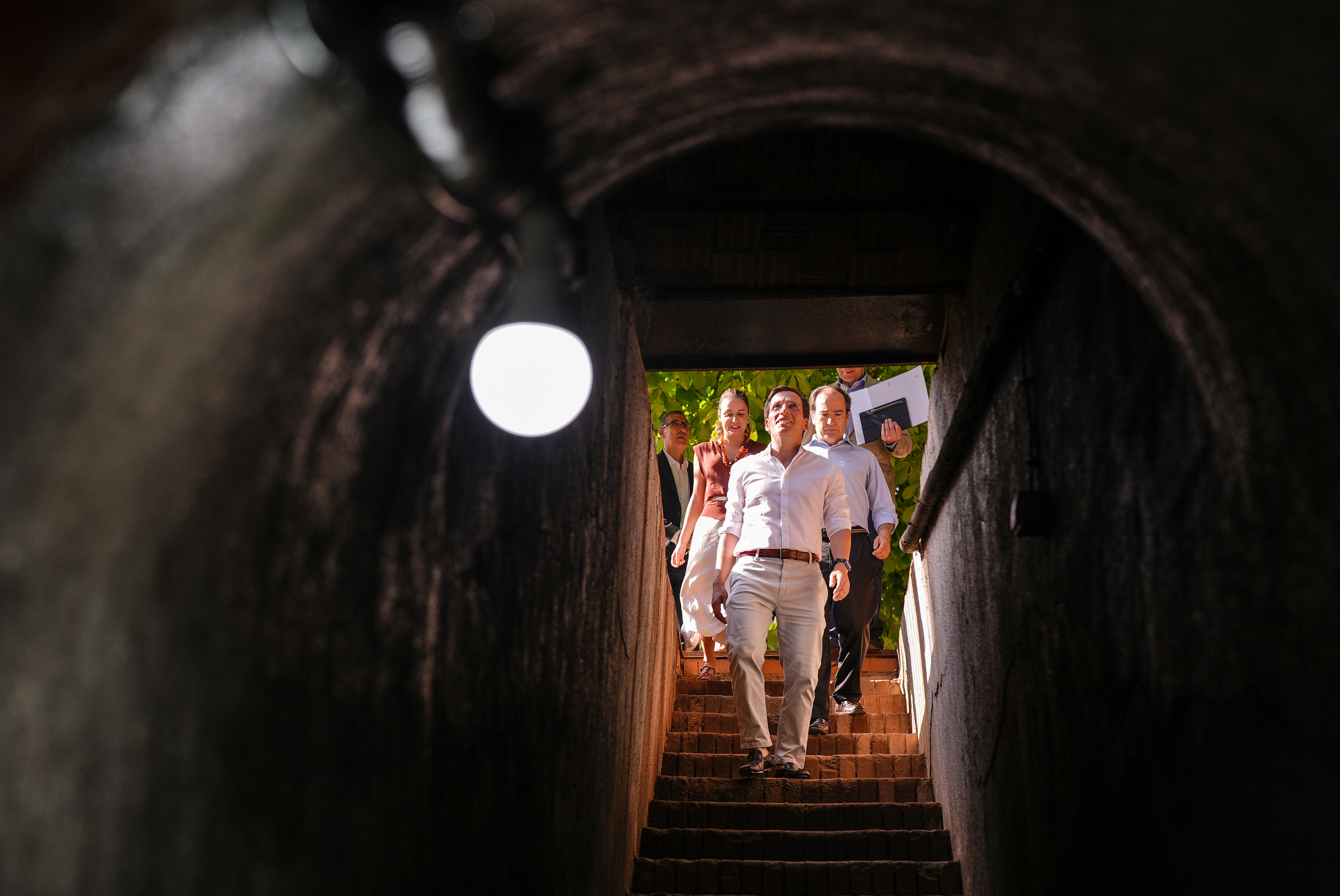 El alcalde de Madrid, José Luis Martínez-Almeida, acompañado por el delegado de Urbanismo, Medio Ambiente y Movilidad, Borja Carabante, y la concejala de Retiro, Andrea Levy, ha abierto esta mañana las compuertas que sellan este paraje, para comprobar que se mantiene en buen estado. 45 escaleras conducen hacia su interior, lo que hace que desde 1938 permanezca cerrado por sus condiciones de accesibilidad.