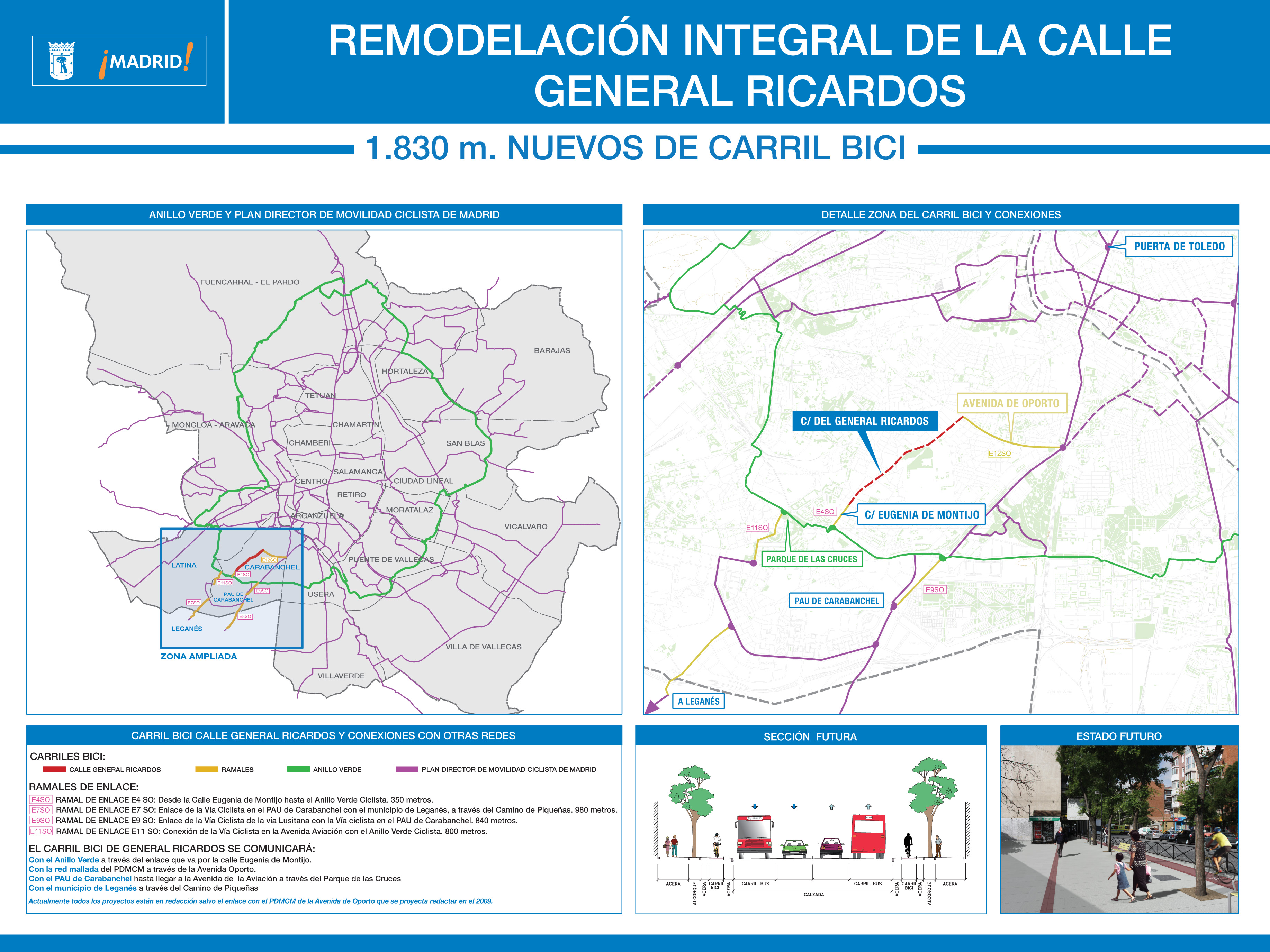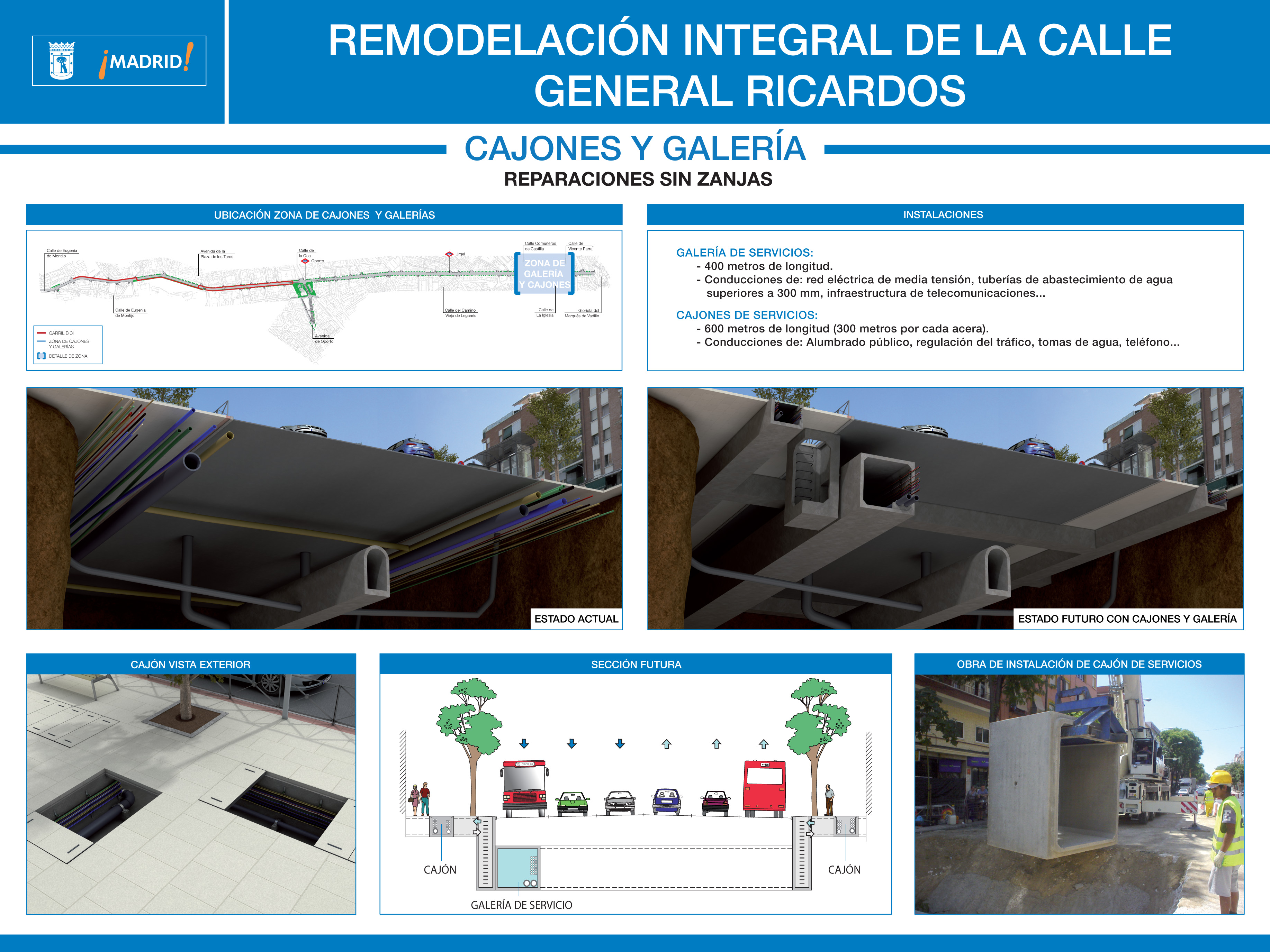 Los vecinos de la popular calle de General Ricardos disfrutarán desde el próximo verano de un carril-bici de casi dos kilómetros, y además no tendrán que sufrir más la apertura de zanjas para la instalación o reparación de los servicios de suministro gracias a la construcción de una galería que agrupará las infraestructuras eléctricas, de abastecimiento de agua y de telecomunicaciones, así como las de los servicios municipales de regulación del tráfico o de alumbrado público. Son algunas de las actuaciones destacadas de la remodelación integral que desde el pasado febrero lleva a cabo el Ayuntamiento de Madrid en una de las más importantes arterias de Carabanchel.