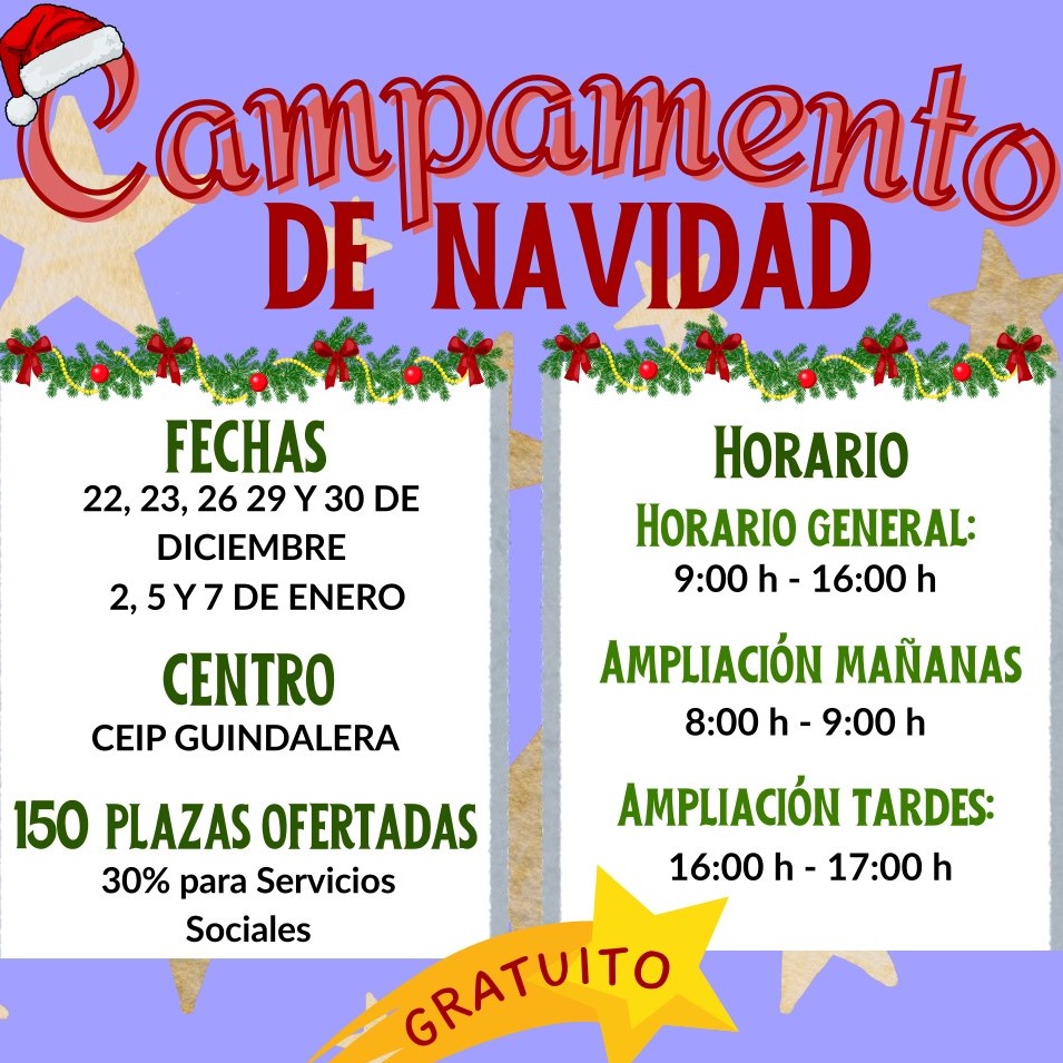 El distrito de Salamanca oferta 150 plazas gratuitas para su campamento de NavidadEl campamento de Navidad organizado por la Junta Municipal de Salamanca inicia hoy su plazo de inscripciones para el periodo de vacaciones navideñas 2025-2026. La iniciativa, totalmente gratuita, oferta 150 plazas de actividades de ocio lúdico-educativas para fomentar la conciliación laboral y familiar en días no lectivos. El campamento, que incluye los servicios de desayuno y comida, tendrá lugar en el CEIP Guindalera los días 22, 23, 26, 29 y 30 de diciembre y 2, 5 y 7 de enero.