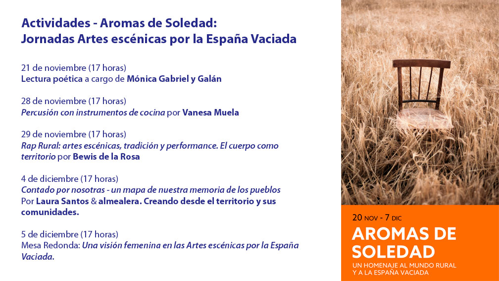 Actividades - Aromas de Soledad: Jornadas Artes escénicas por la España VaciadaDel viernes 21 de noviembre de 2025 al sábado 6 de diciembre de 2025