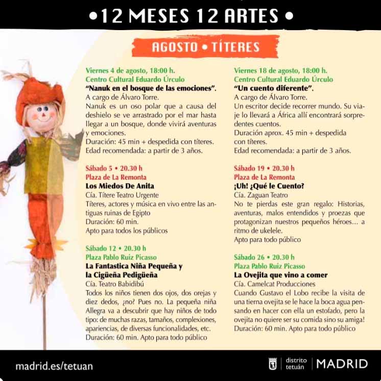 Este viernes, 4 de agosto, arranca el festival de títeres ‘doce meses doce artes’ en el distrito de Tetuán con seis montajes programados a lo largo del mes de agosto en tres emplazamientos distintos: el Centro Cultural Eduardo Úrculo y las plazas de La Remonta y Pablo Ruiz Picasso.