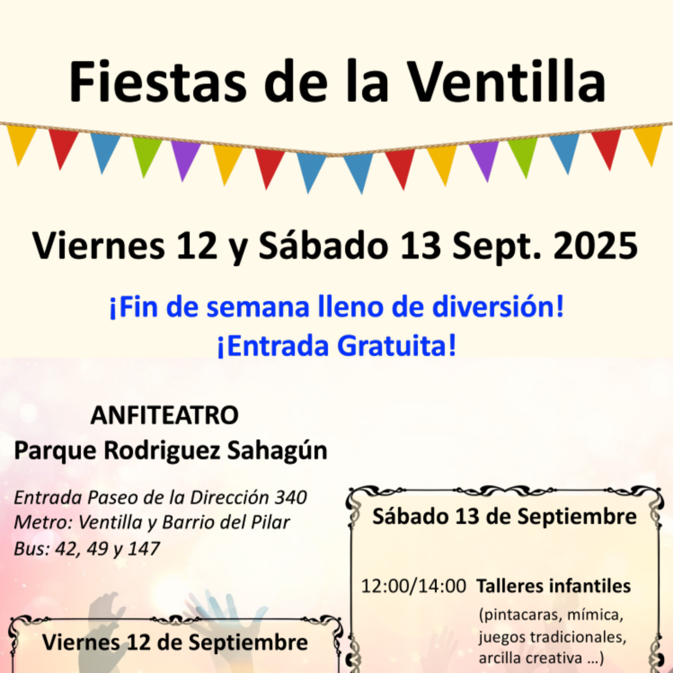 Las fiestas de La Ventilla llegan a Tetuán con música, talleres infantiles, títeres y poesíaLa Junta Municipal de Tetuán, en colaboración con la Asociación Vecinal y Huerto Urbano Ventilla-Almenara, celebra las fiestas de La Ventilla los próximos viernes 12 y sábado 13 de septiembre en el anfiteatro del parque Rodríguez Sahagún, con actividades gratuitas variadas para los vecinos del barrio.