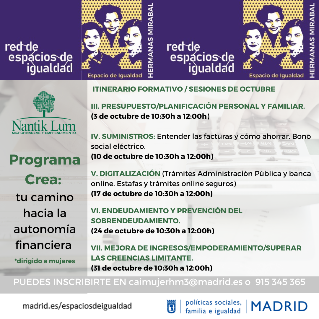 El Programa Crea tiene por objetivo el fomento del ahorro y la mejora de sus finanzas familiares, así como de sus competencias de búsqueda activa de empleo, trabajar su economía doméstica y su planificación familiar. Para ello, hemos diseñado un completo itinerario formativo que consiste en siete sesiones. Facilitado por Nantik Lum.