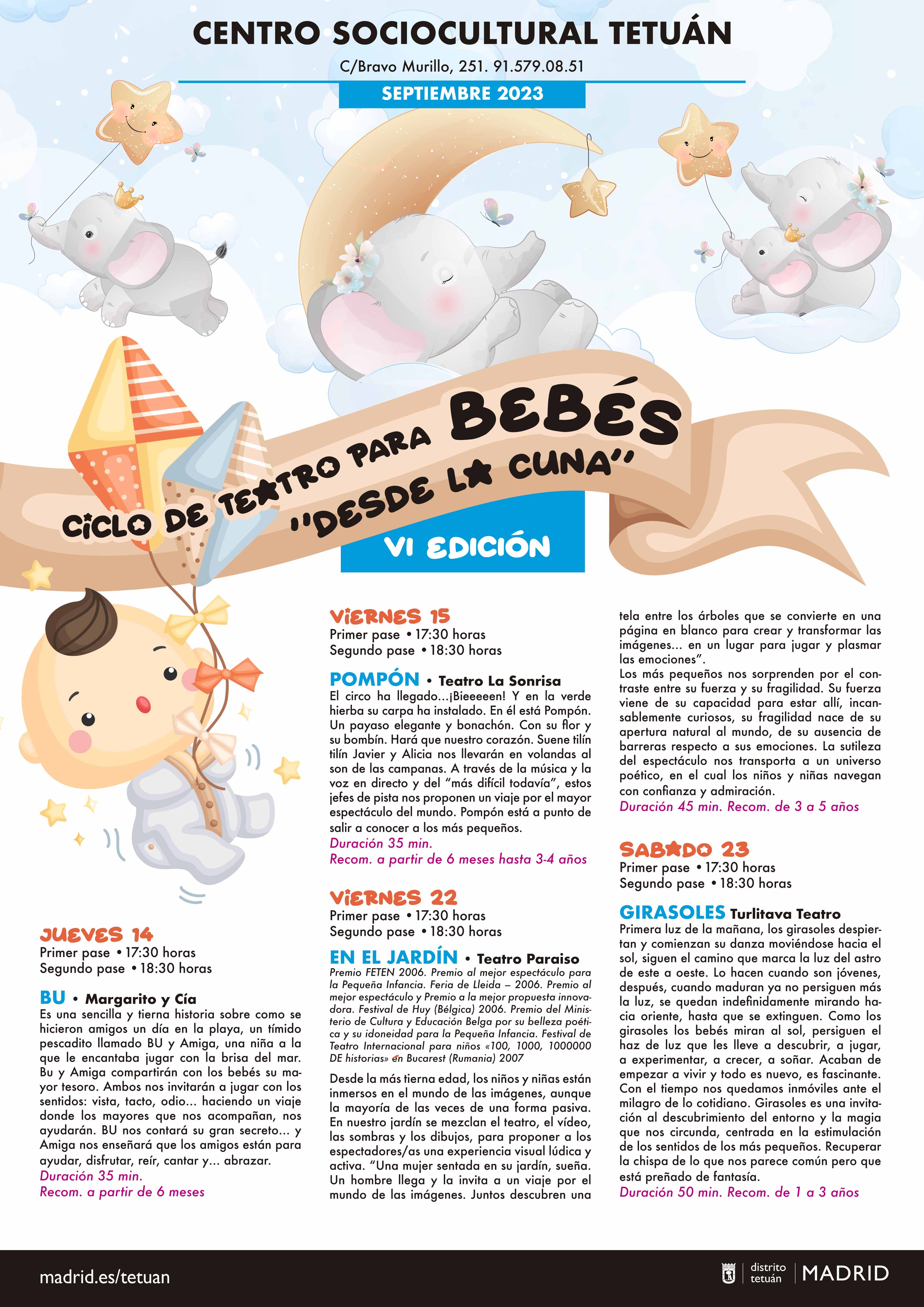 El distrito de Tetuán recibe este jueves 14 y hasta el sábado 23 de septiembre una nueva edición de teatro para bebés. El ciclo ‘Desde la cuna’ cumple este año su sexta edición con cuatro títulos, que tienen una duración de entre 35 a 50 minutos, y dos pases diarios: a las 17:30 y a las 18:30 h. Cada montaje, adecuado a sus códigos y sus tiempos de atención, tendrá lugar en el Centro Cultural Tetuán (calle Bravo Murillo, 251) a cargo de cuatro compañías. Las entradas son gratuitas y pueden retirarse desde este martes para los espectáculos del próximo fin de semana.